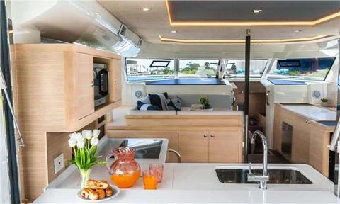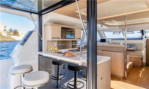 Aft Deck with table for 6, Bar with Stools, Microwave, Cook Top, Refrigerator, Freezer, Dishwasher.