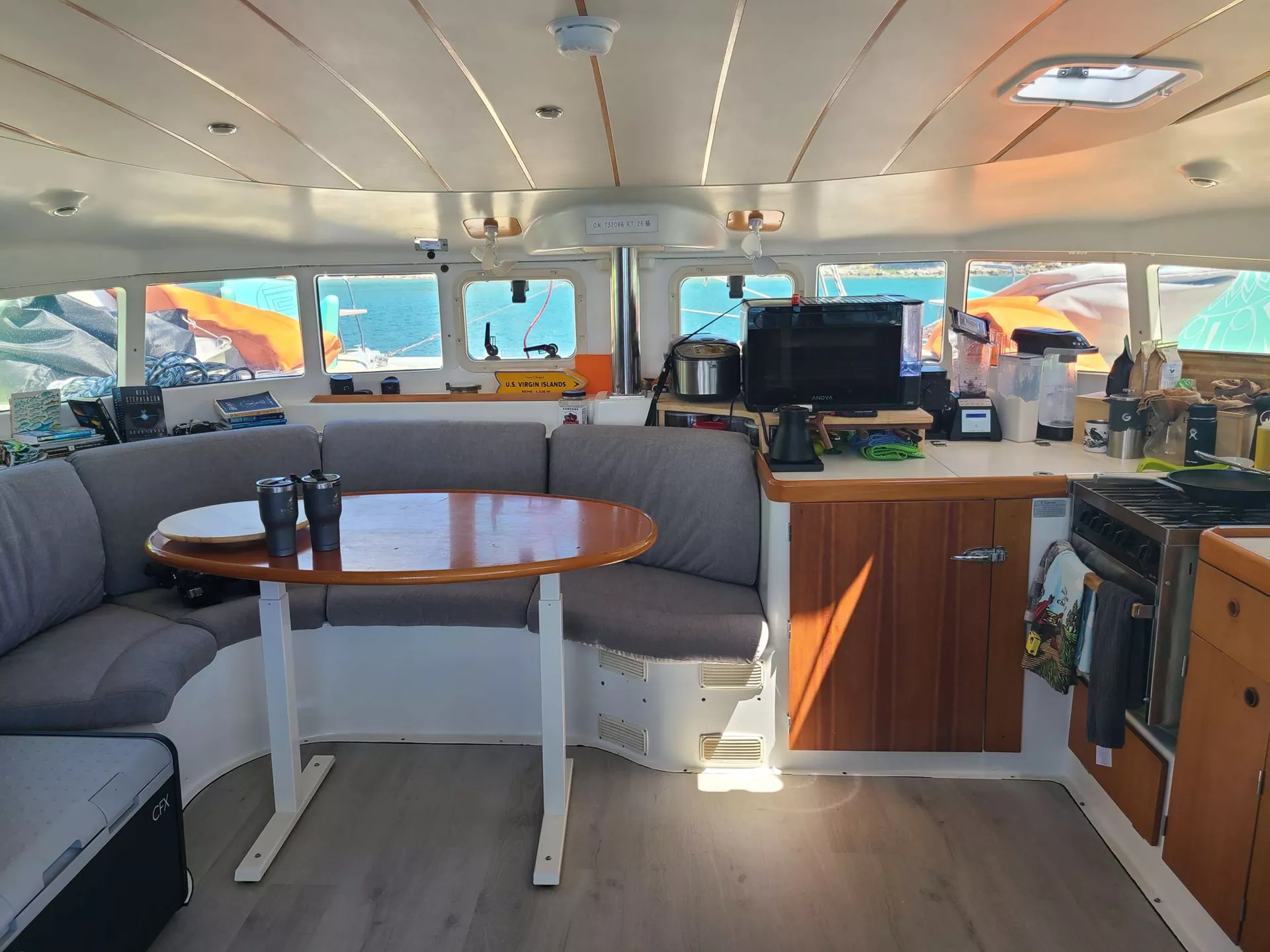 Mimbaw can accommodate 6 guests in 3 cabins.The Master cabin has a queen size bed, and its own shower and toilet. 2 Guest cabins have a queen size bed, and a shared shower and toilet. Eco-friendly bottom paint, new accent paint, 1500 Watt Solar Panels on the hard top, LEDs throughout, fans, and cabin-top lounging area