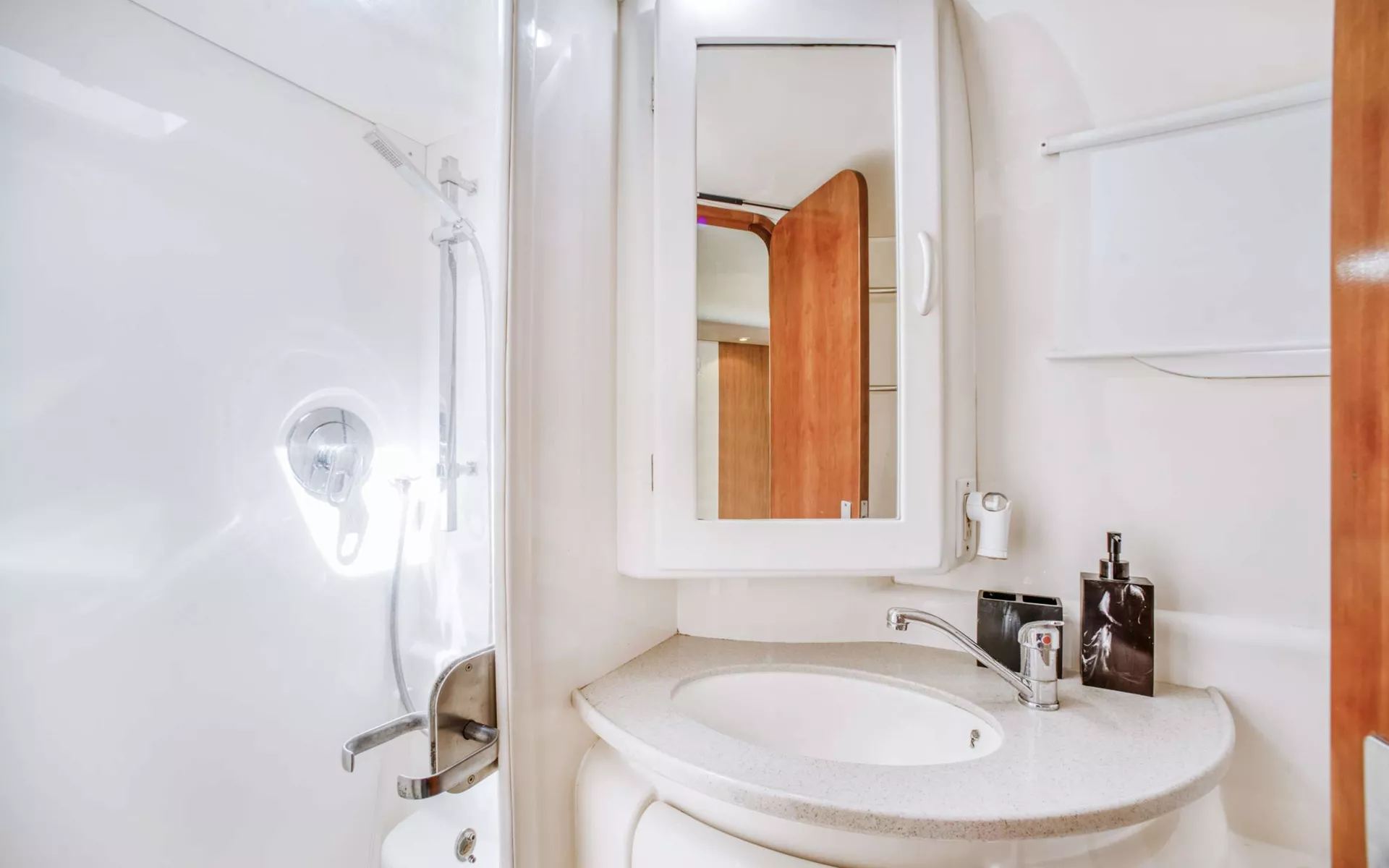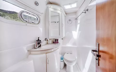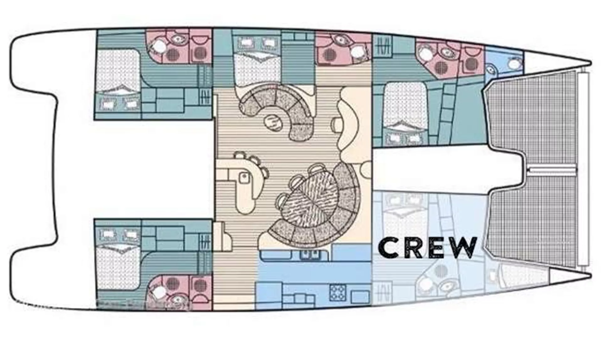 Foredeck features large deck space and trampolines with built in back rests. Cabins are large and comfortable, with more than ample storage for clothing and personal effects, and heads feature separate shower stalls.