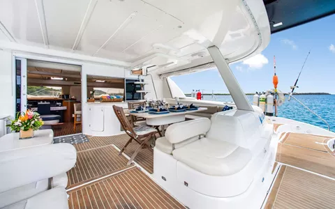 Flybridge accessed by stairs in the cockpit lead to a large lounge area with cushioned mats, beanbags, and a table for 4 for coffee or cocktails.