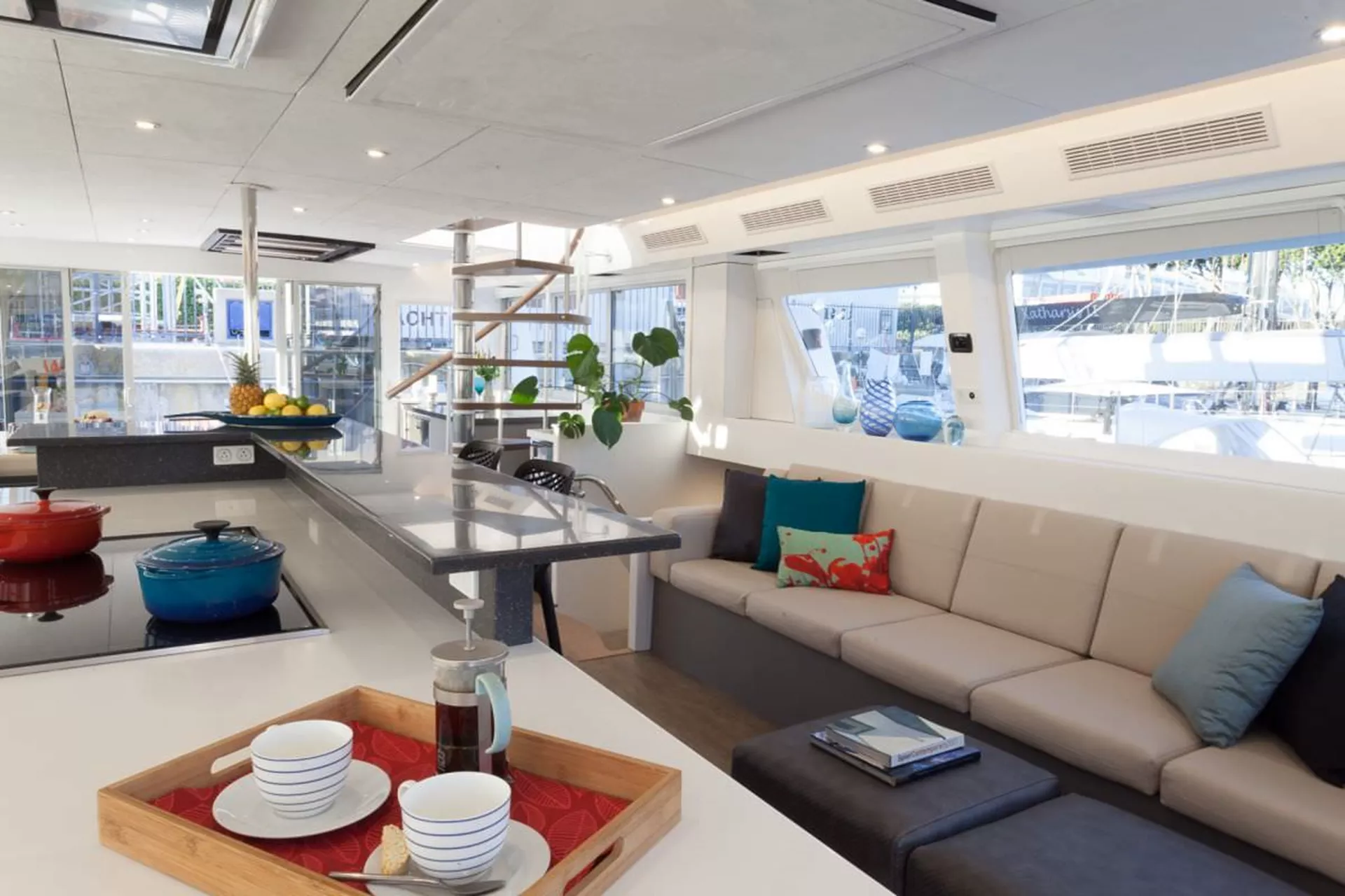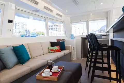 Main salon offers "Formal" dining for all meals, beautiful lounge area with sit down bar and huge galley for the chef to create works of art. The yacht is fully air-conditioned for clients comfort. Main salon opens onto aft deck and has spiral staircase to top deck.