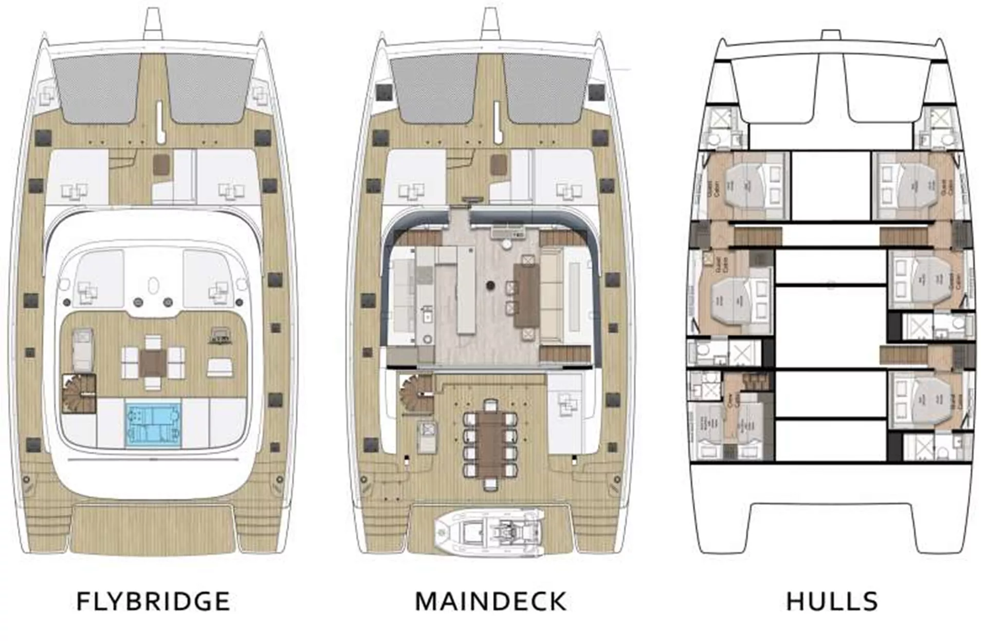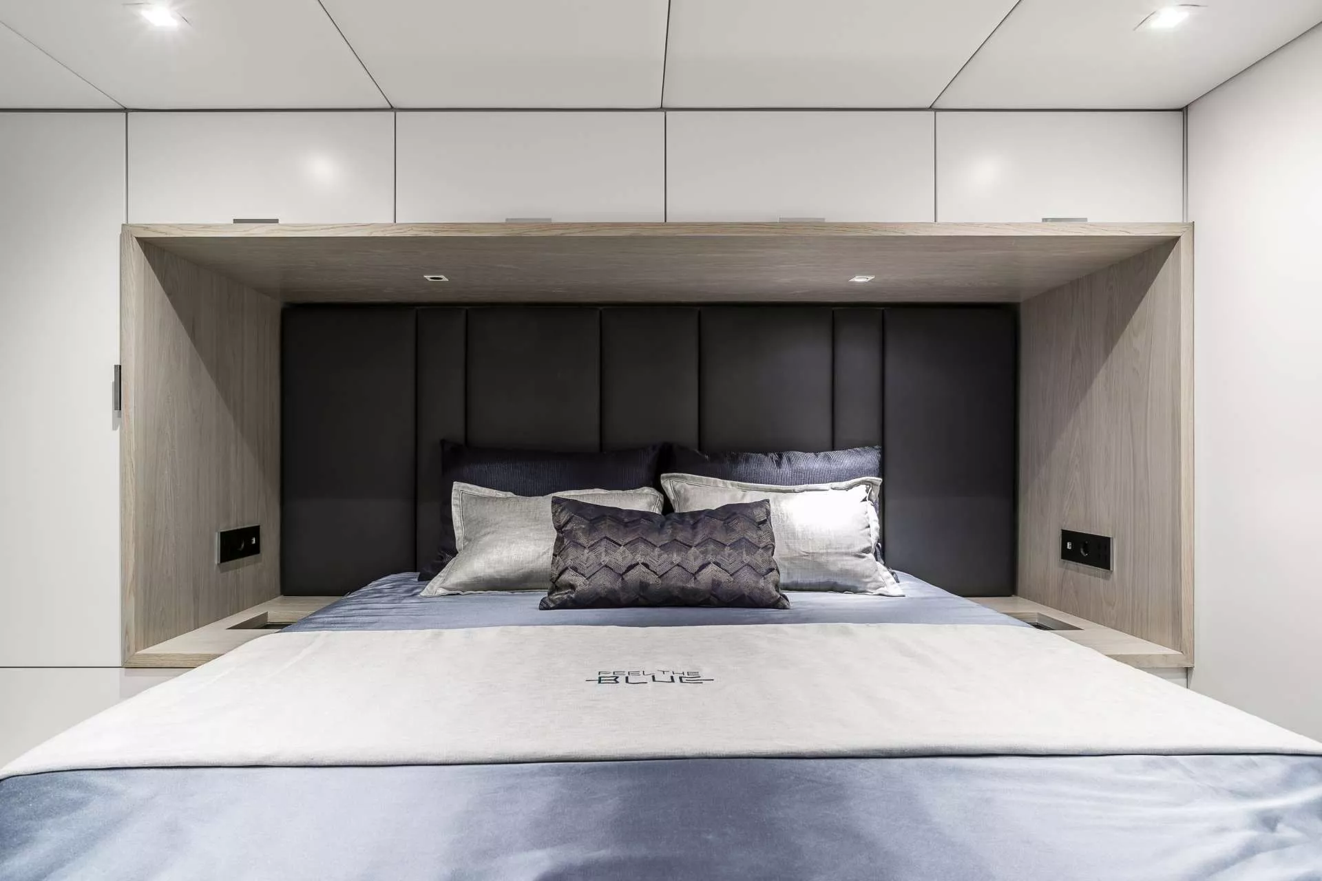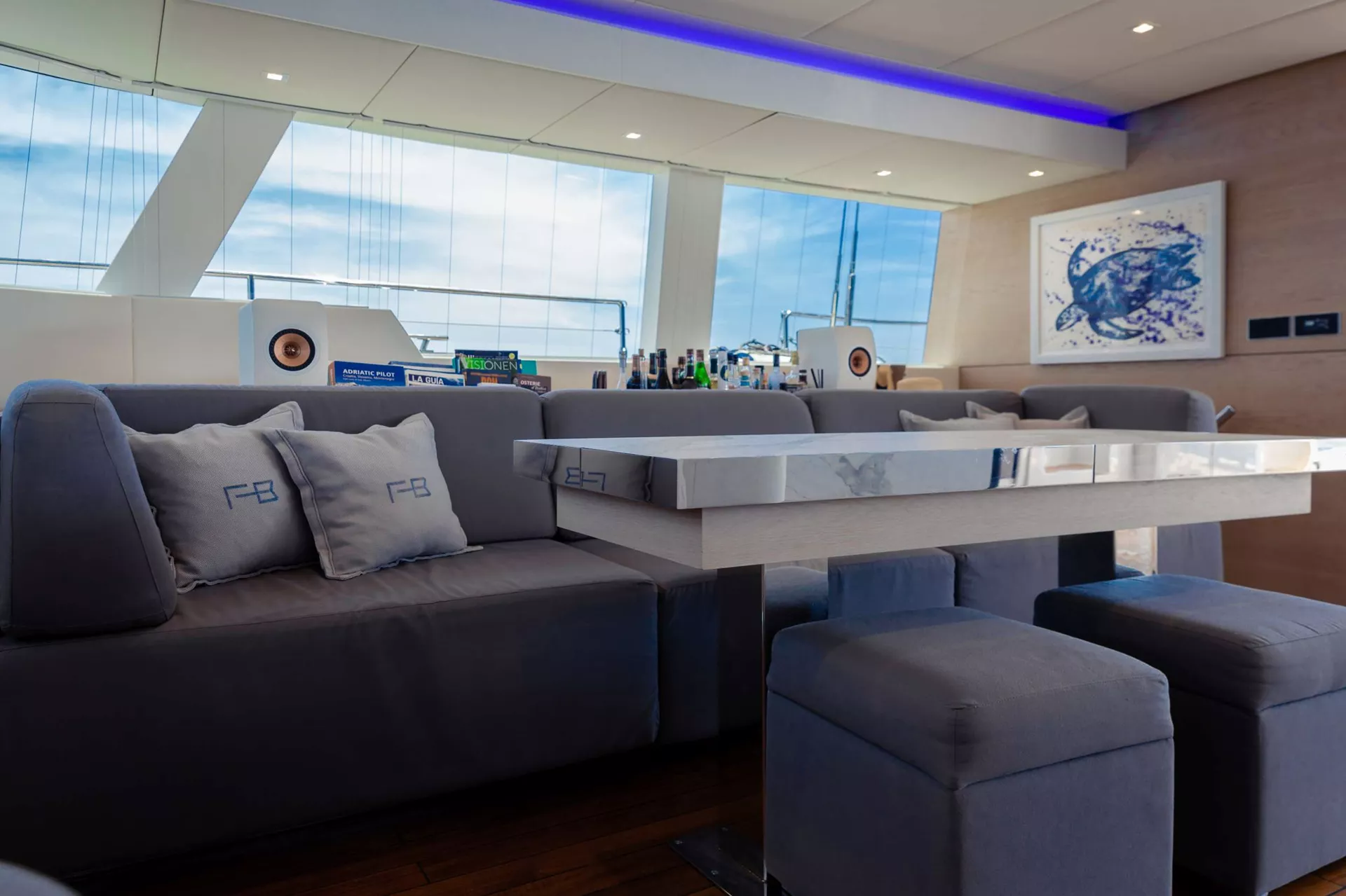 FEEL THE BLUE comes with 5 elegant en suite cabins designed in modern nautical décor with soft relaxing colours that can comfortably accommodate up to 10 guests. The yacht’s vast saloon and spacious cockpit create an ample semi-open lounging area combined with a stylish and functional galley. For maximum relaxation, the yacht features a remarkable front terrace an impressive flybridge equipped with a dining table for 8 guests, large sun pads and a wet bar with barbecue.