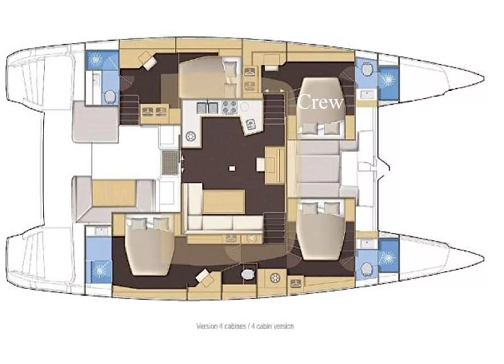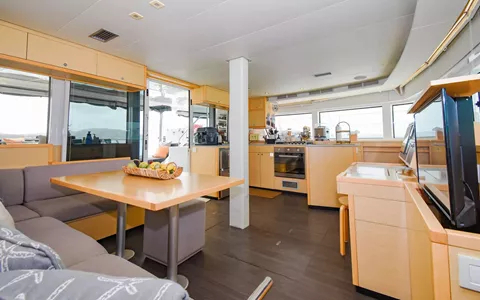 There are tremendous amounts of entertaining and relaxing space on board this vessel. The Flybridge: where the helm and sailing functions meet the enormous convertible settee- provide the best seat in the house whether under sail or under stars. The Forward Cockpit Lounge: where morning coffee meets the sunrise. The Aft Cockpit: where the exquisite meals are served and chaise lounges are spread throughout the yacht. The Main Salon: which houses the open-concept galley, large sofa-chaise and flat-screen TV. And also a more formal dining area should that be desired.