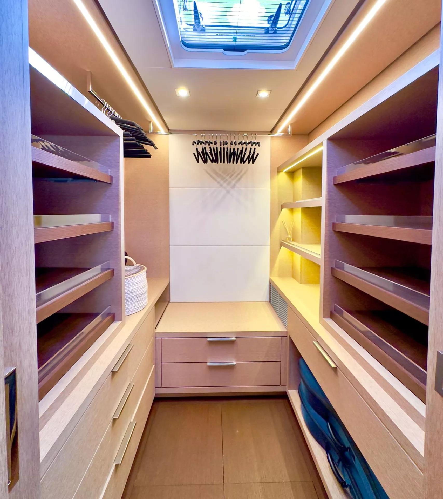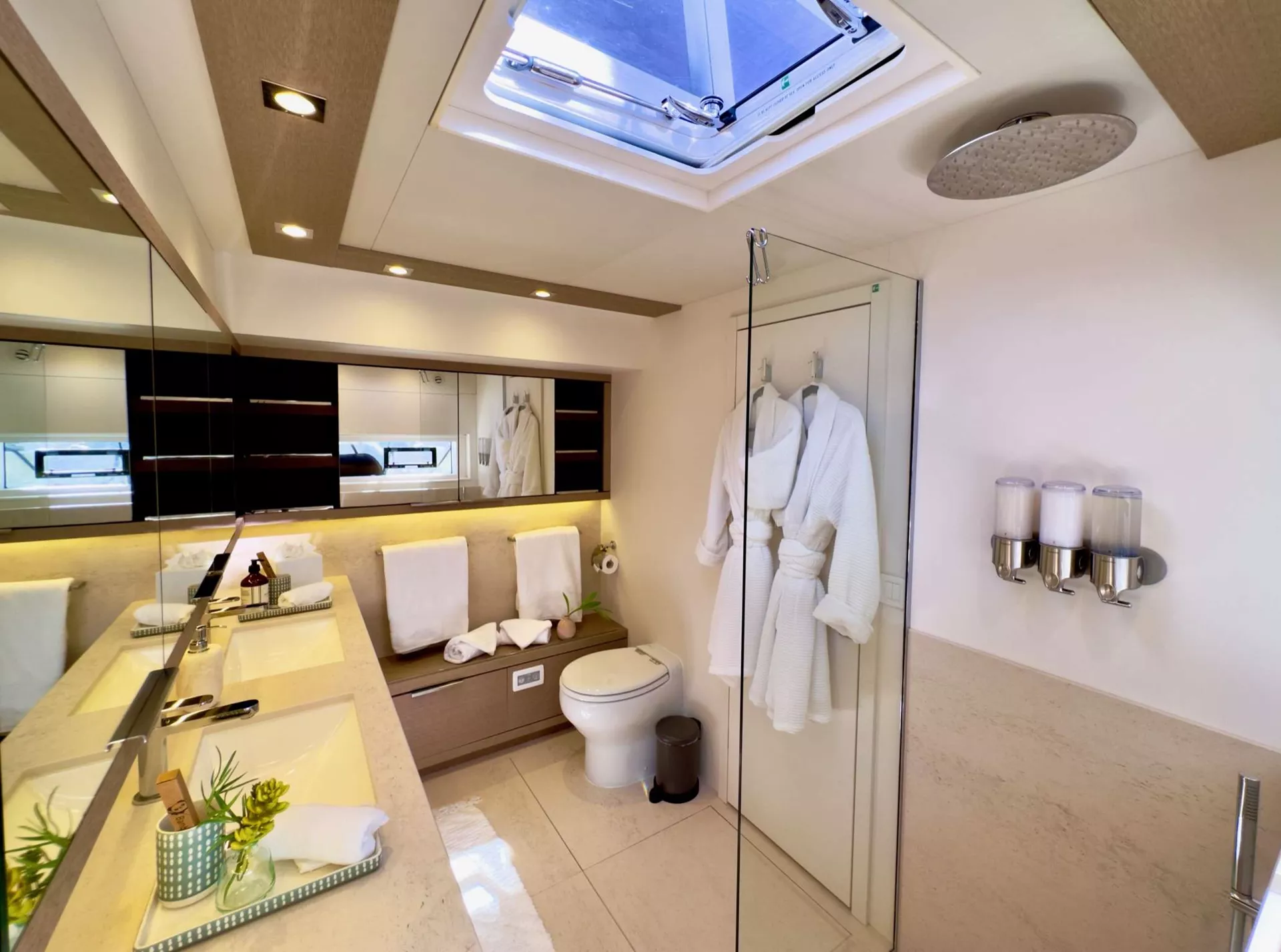 Twin Flame 77 accommodates 8 guests in 4 spacious ensuite cabins. The master stateroom and the port aft cabin include king size beds, with the other two cabins having queen beds. The port aft cabin can also be converted into twin beds instead of a king. All beds have 3 inch memory foam toppers.