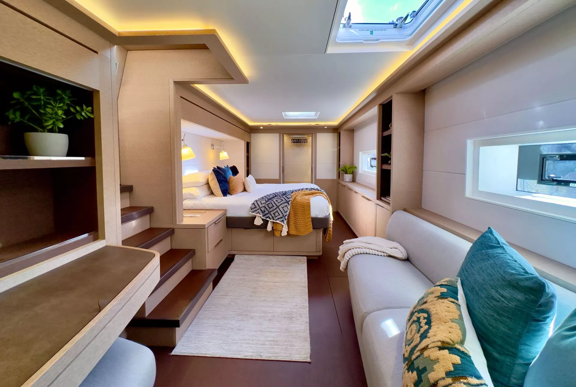 The interior has a layout optimized for space and comfort. The salon is bright, comfortable and roomy and opens not only to the aft cockpit but also directly to the forward cockpit for seamless movement around the yacht. There is a massive flybridge affording an uncompromising 360* view.