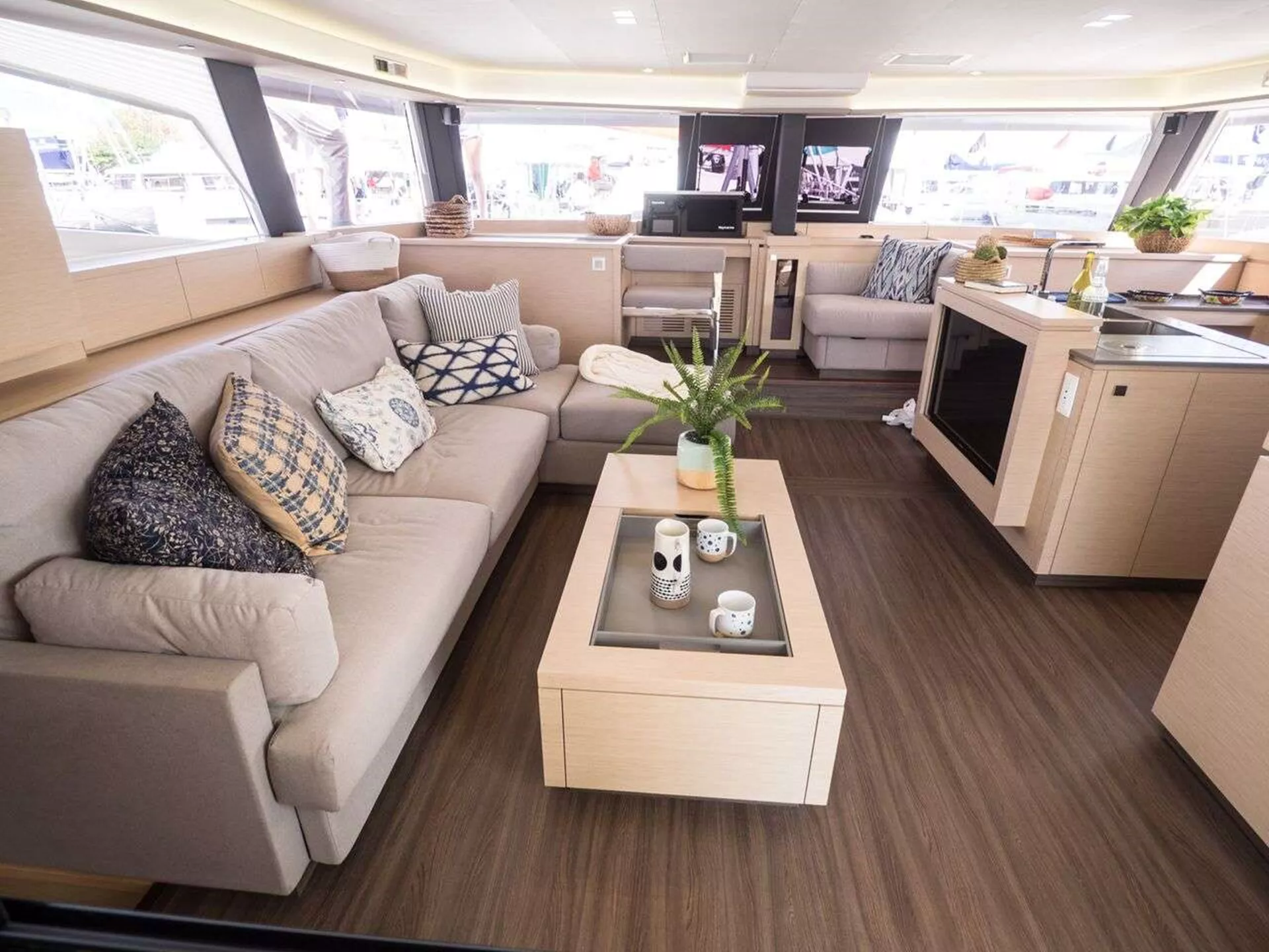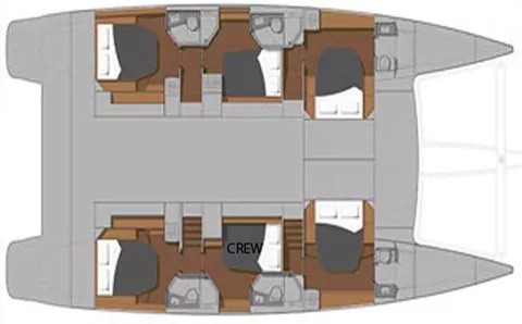5 spacious and well appointed staterooms each with en-suite dry bathrooms and separate stall showers. Toilets are all electric and have single press flush cycle. Headroom in cabins and saloon is just over 6’ 8”, toilet is 6’ 7” and shower stall is 6’ 11”. Cockpit has 6’ 11” of headroom. Yacht has quiet central A/C for guest comfort and each stateroom has individual A/C controls. Fly-bridge has full bimini over upper lounge area for shade.