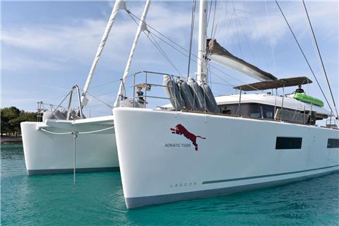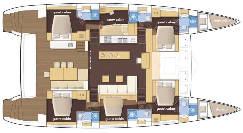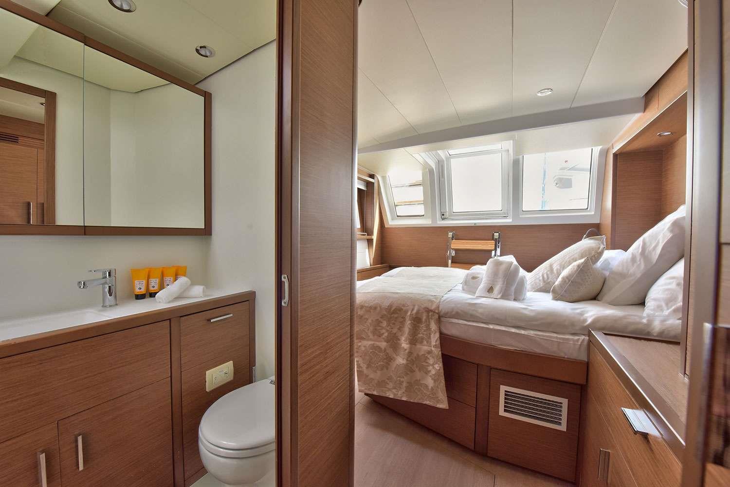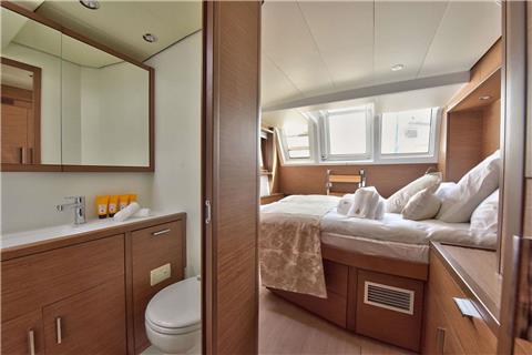Lagoon 620 "Adriatic Tiger", available for charter in Croatia, has 5 queen size berth cabins (sleeps up to 10 guests), all en-suite, plus separate cabins for three professional crew members.