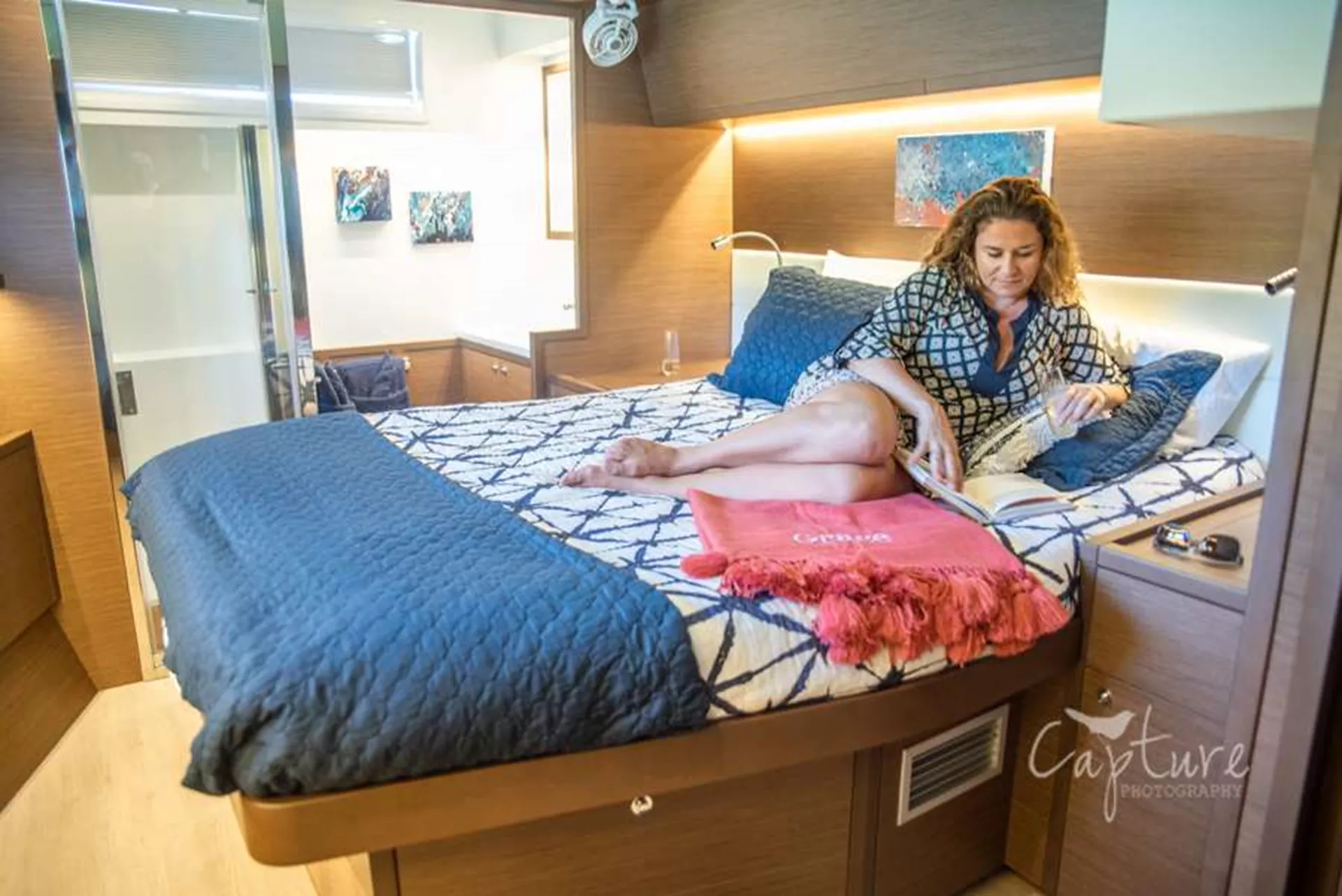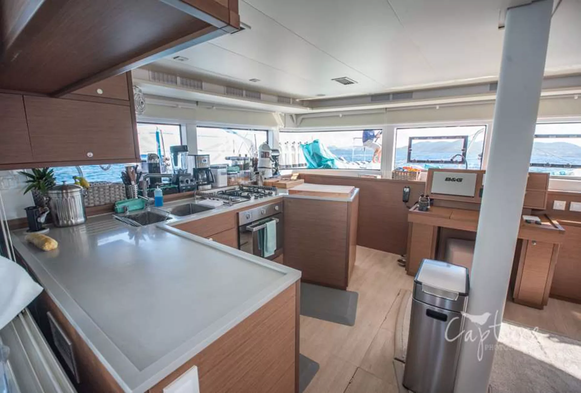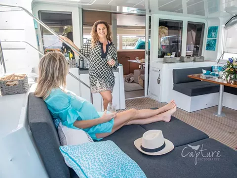 Tremendous Entertaining and Relaxing Areas are on Board as well! Grace’s view from The Flybridge is Unsurpassed. As our Captain steers you to Blue Horizons, enjoy the view from Grace’s Enormous Convertible Settee! One of the Best Seats in the House! Or Enjoy the Sunrise while Sipping your Coffee in the Forward Cockpit Lounge & Trampoline Area. Although your Favorite Place may be The Aft Cockpit where the Exquisite Gourmet Cuisine will be served. The Main Salon has an Open Concept Galley featuring Kitchen & Bar with Table, Large Sofa-Chaise Seating and the TV/Entertainment System & Apple TV.