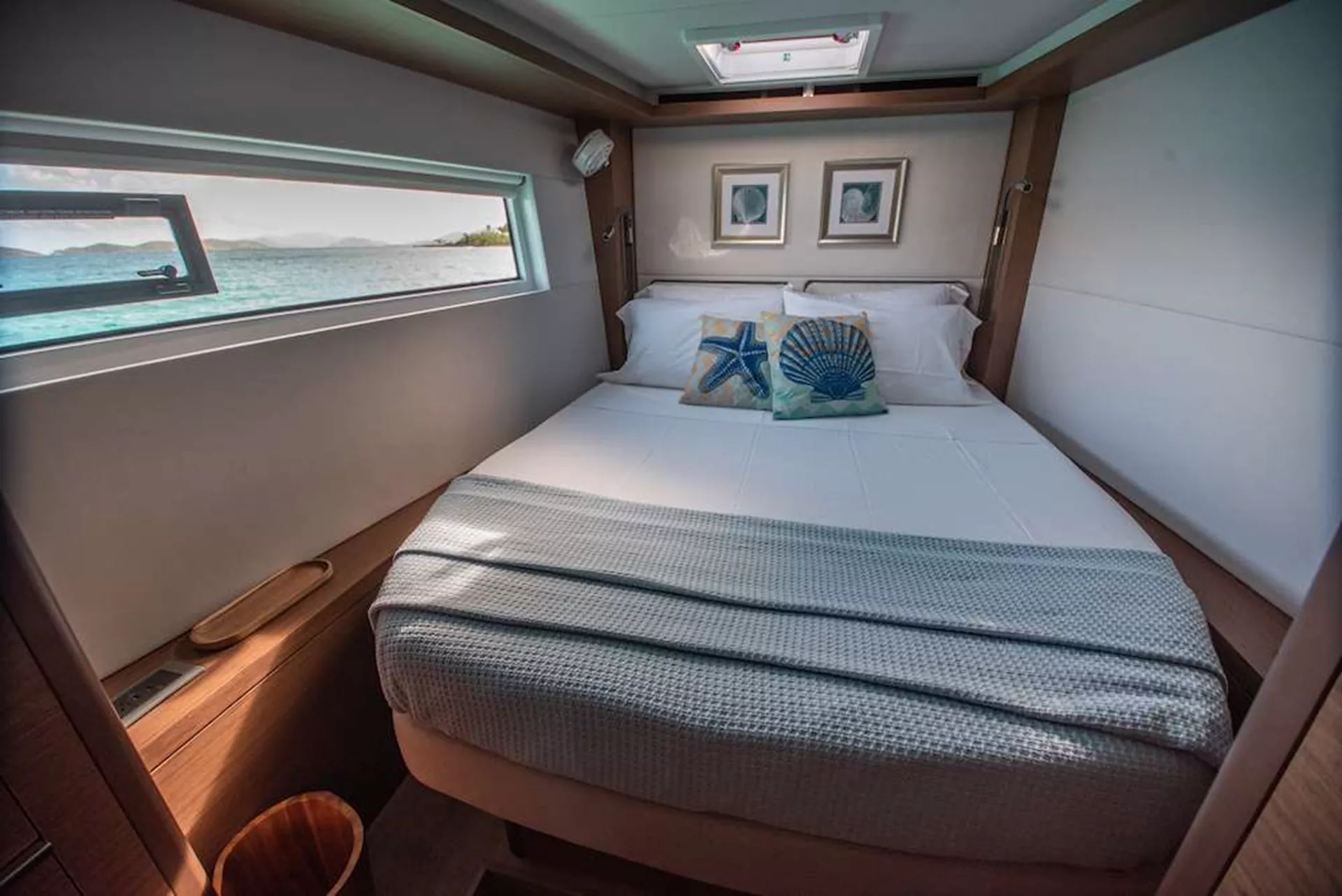 3 queen ensuite cabins and midship cabin are available to guests. Midship and port forward cabins share head. Crew will take port aft queen cabin.