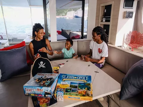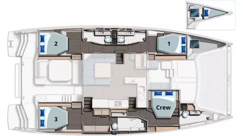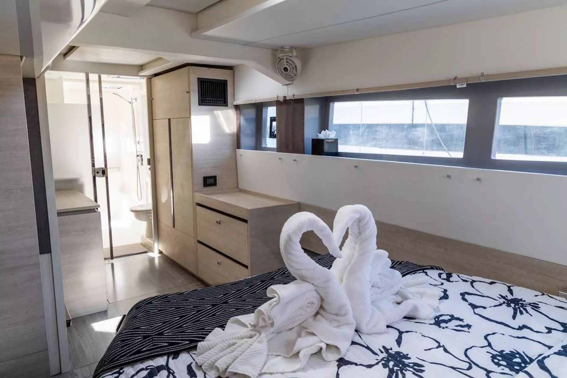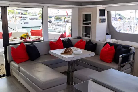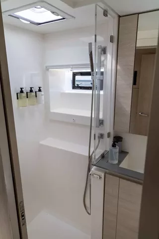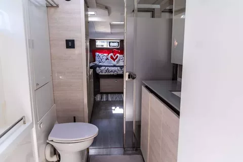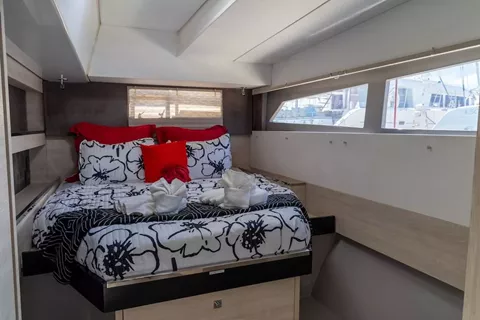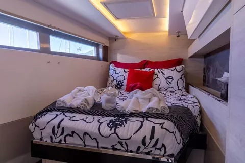 Lounging around on the flybridge a few steps removed from the helm station on a breezy afternoon in the Virgin Islands is pretty darned enjoyable. In fact so is strolling about the boat and taking in the expansive views from numerous vantage points. On this boat, the great outdoors literally pour into the saloon and sleeping cabins thanks to the wall of glass and overhead skylight that spans the saloon.It offers one master cabin with queen berth, lounge area, en-suite bath and equipped with TV and two additional spacious queen cabins each with en-suite bath.