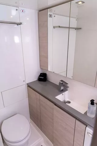 1 master cabin with queen berth, lounge area and en-suite bath, electric toilet and a stall shower. Individual A/C control for guest comfort. Cabin is equipped with TV.