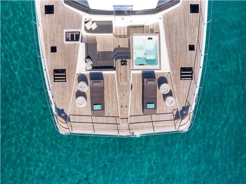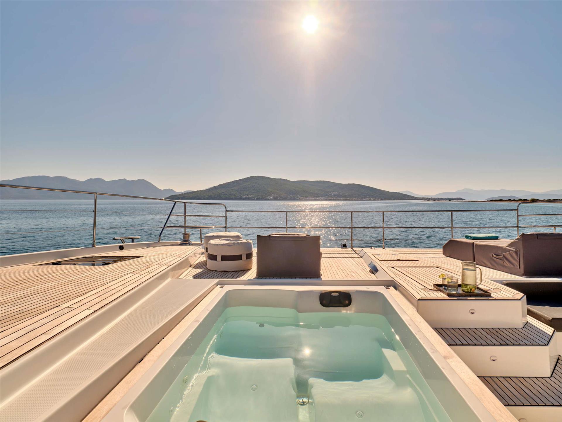 Her vast 32m² Flybridge, foredeck with Jacuzzi, and Owner suite are simply remarkable and all enjoy direct access from the saloon.