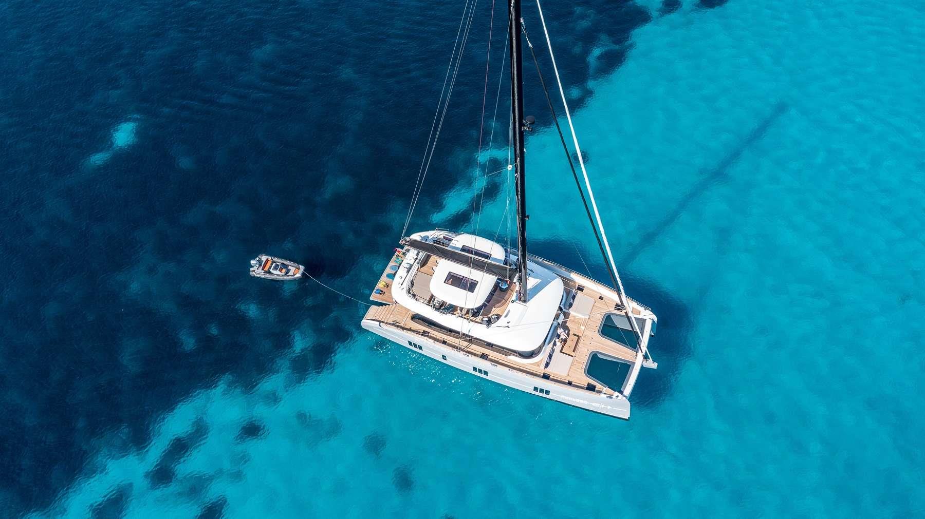 The spacious flybridge is fitted with dual helms, a day bed, additional sun awning, wet bar and a large dining table if you choose to dine up top. All sailing lines lead to the base of the mast, an ideal spot for guests to join in on the sailing action.