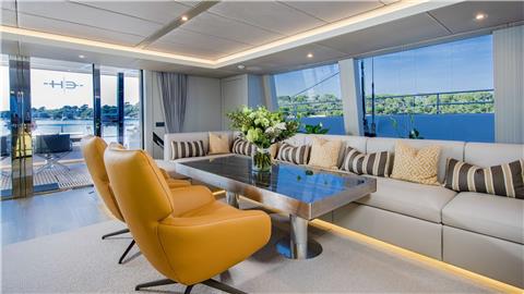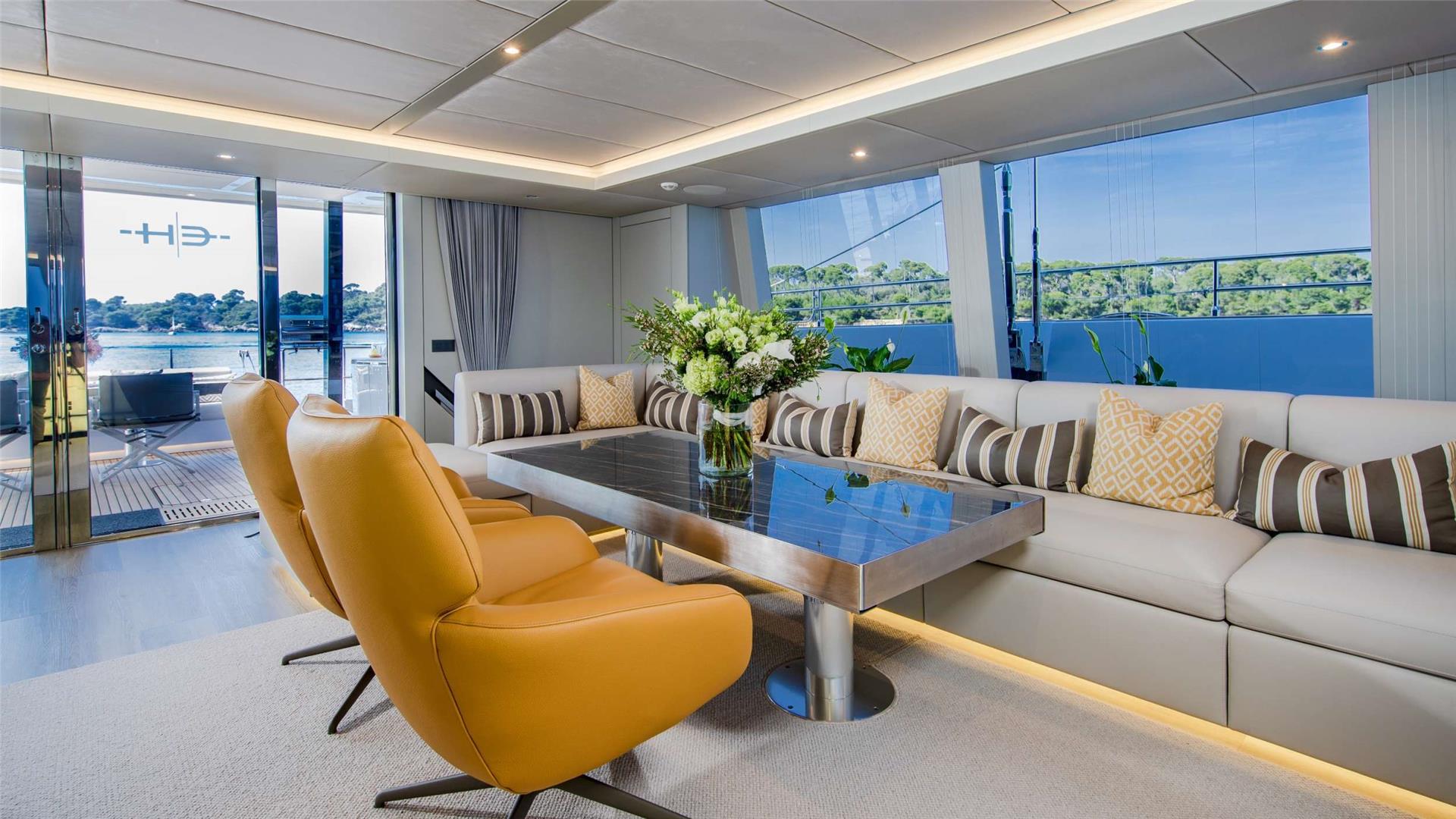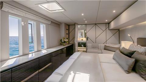 There is a large dining table on the aft alfresco area with a fully stocked wet bar as well as a daybed. Just off the back of the aft dining area is a large hydraulic platform which is where the tender is launched from. The tender, is equally specked with a fusion stereo system, underwater lights, courtesy lights and navigation system. Perfect for daytime tender excursions. The tender platform doubles as a water toy area during the day, where we can launch the seabobs and e-foils or even set up a day lounge for sunbathing and cocktails.
