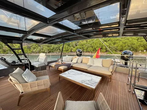 Thanks to the sliding saloon door the interior blends naturally with the outside, opening onto the large, sheltered aft deck and the splendid front terrace. The spacious flybridge features a BBQ, a wet bar and plenty of seating for enjoying the beautiful panoramic views.