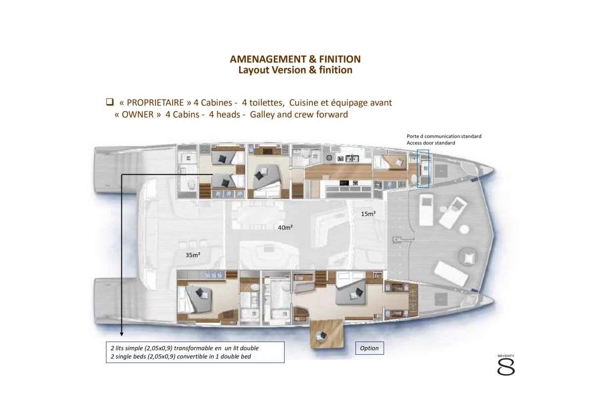 With 35m2 Owner's space forms an elegant and independent whole. Supreme luxury, a private beach of 4 m² opening in the hull planking.