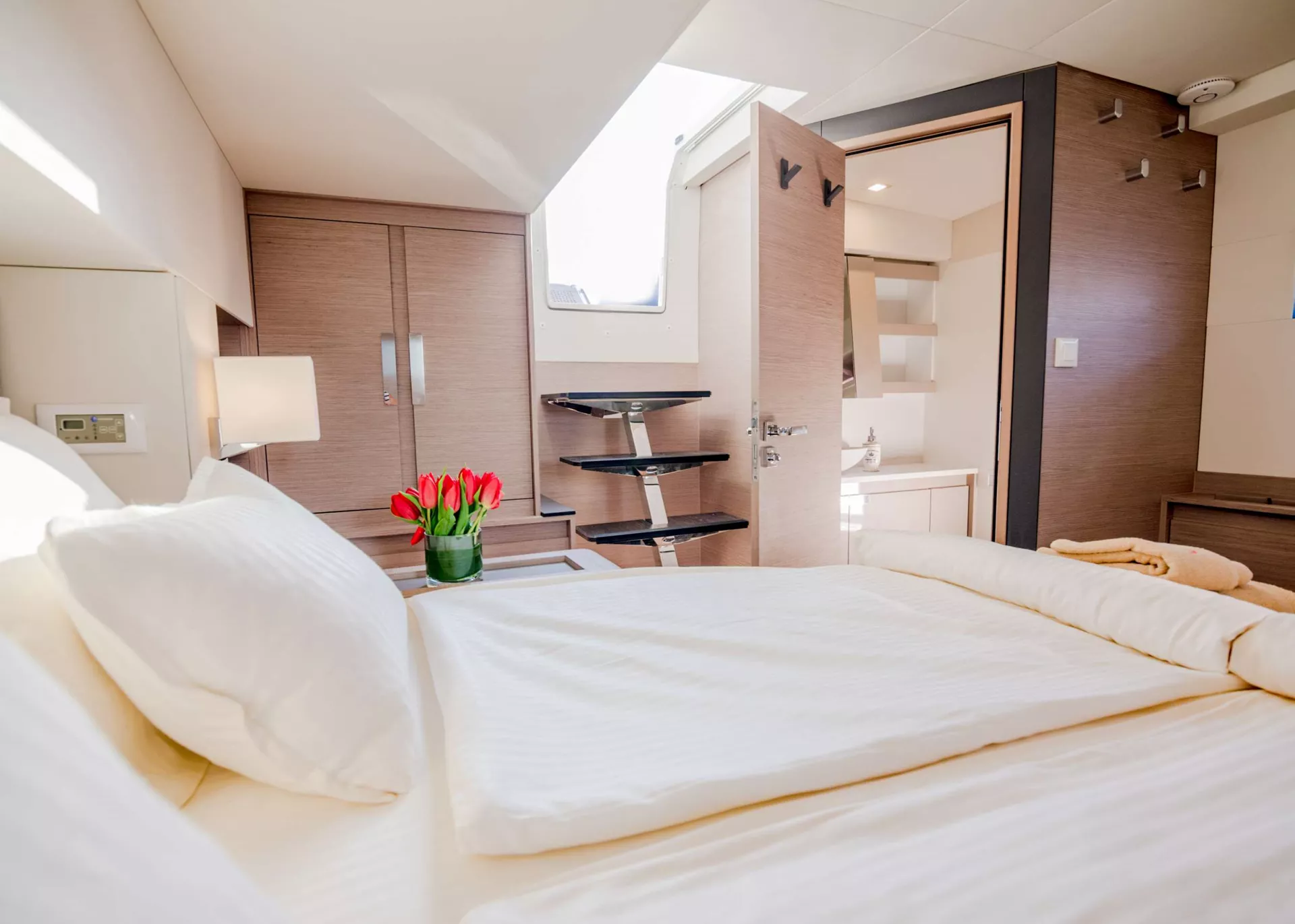 Every inch of Astoria has been thoughtfully crafted to enhance comfort and style. Her expansive 27.5m² aft cockpit sets the stage for elegant alfresco dining and relaxed socializing, while the foredeck’s modular sunbathing stations provide a private haven for lounging and enjoying the sea breeze. The spectacular flybridge offers panoramic views and abundant space for sunbathing, dining, or enjoying sunset cocktails — a true open-air lounge that captures the spirit of luxury sailing. With her galley-up layout, Astoria features a bright, spacious main saloon that seamlessly connects to both the foredeck and aft deck, creating a natural flow between indoor and outdoor living. Every space has been designed to encourage connection while maintaining a sense of privacy and tranquility.