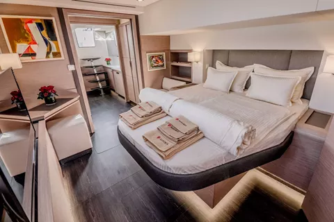 S/Y Astoria accommodates up to 10 guests in five luxurious cabins, including a generous master suite, beautifully appointed for relaxation and privacy and four elegant queen-bed cabins, each with its own private en-suite bathroom. Her stylish interior combines contemporary design with warm tones and natural light, offering a sophisticated yet welcoming atmosphere.