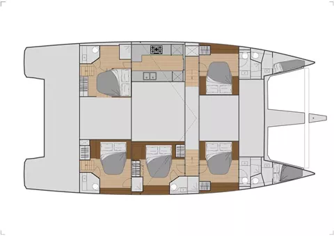 5 queen bed cabins, all with en-suite facilities, galley down.