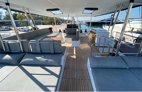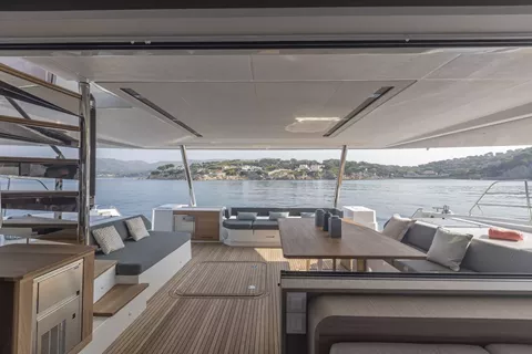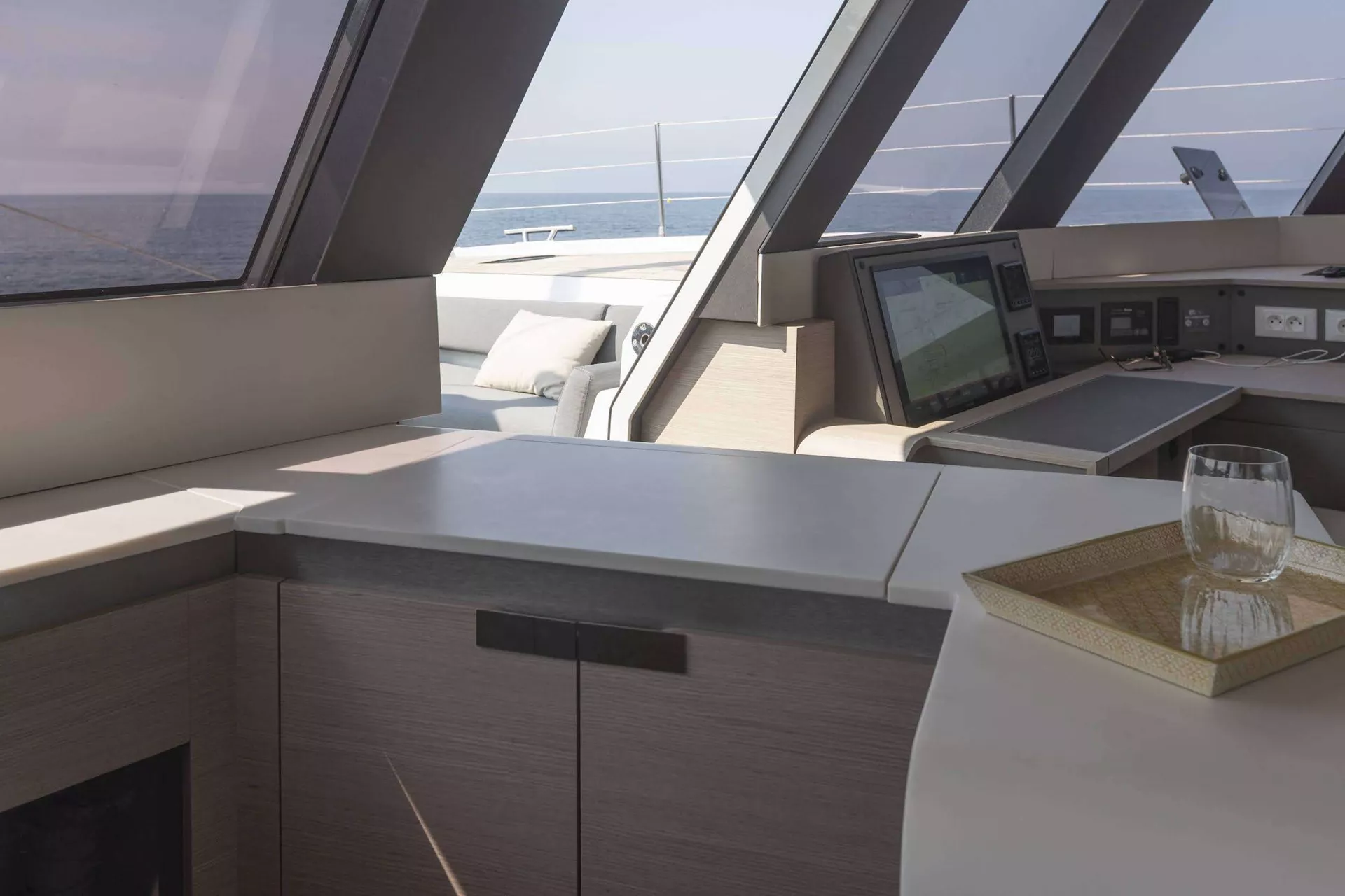 Every detail of Allure 59 has been meticulously designed to balance sociability and serenity. Her 27.5m² aft cockpit is ideal for alfresco dining and relaxed gatherings, while the foredeck features modular sunbeds, providing a private oasis for sunbathing or simply soaking in the views under sail. The spacious flybridge invites guests to unwind with panoramic vistas, enjoy sunset cocktails, or celebrate under the stars. Inside, her bright and inviting saloon flows seamlessly between the lounge and dining areas, creating a sophisticated atmosphere enhanced by her galley-down layout, which ensures space and openness in the main living area.