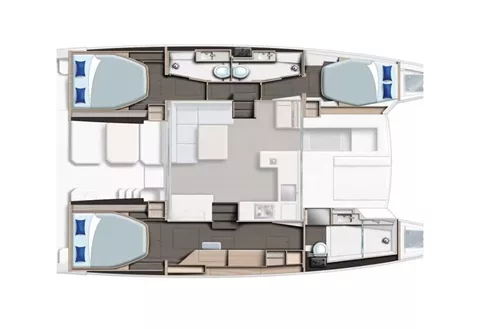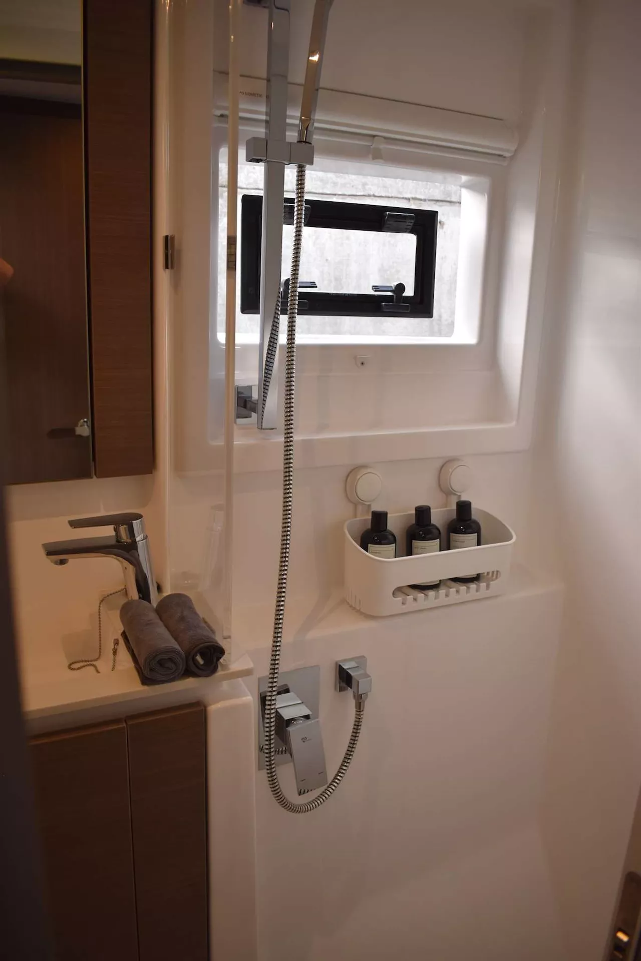 The cabins include their own private en-suite bathrooms. Both bathrooms include their own designated shower area; a feature not currently found on catamarans in this size range.