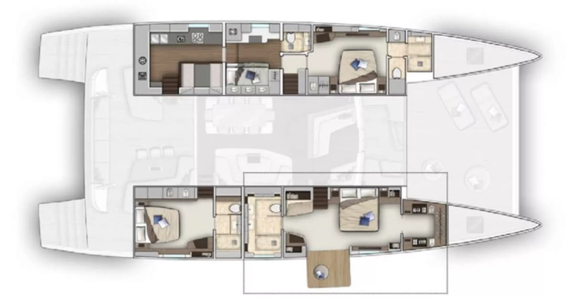 spacious master cabin featuring private sitting area, his & hers closets, and a private balcony. Two VIP cabins both feature queen berths all with private bathrooms.