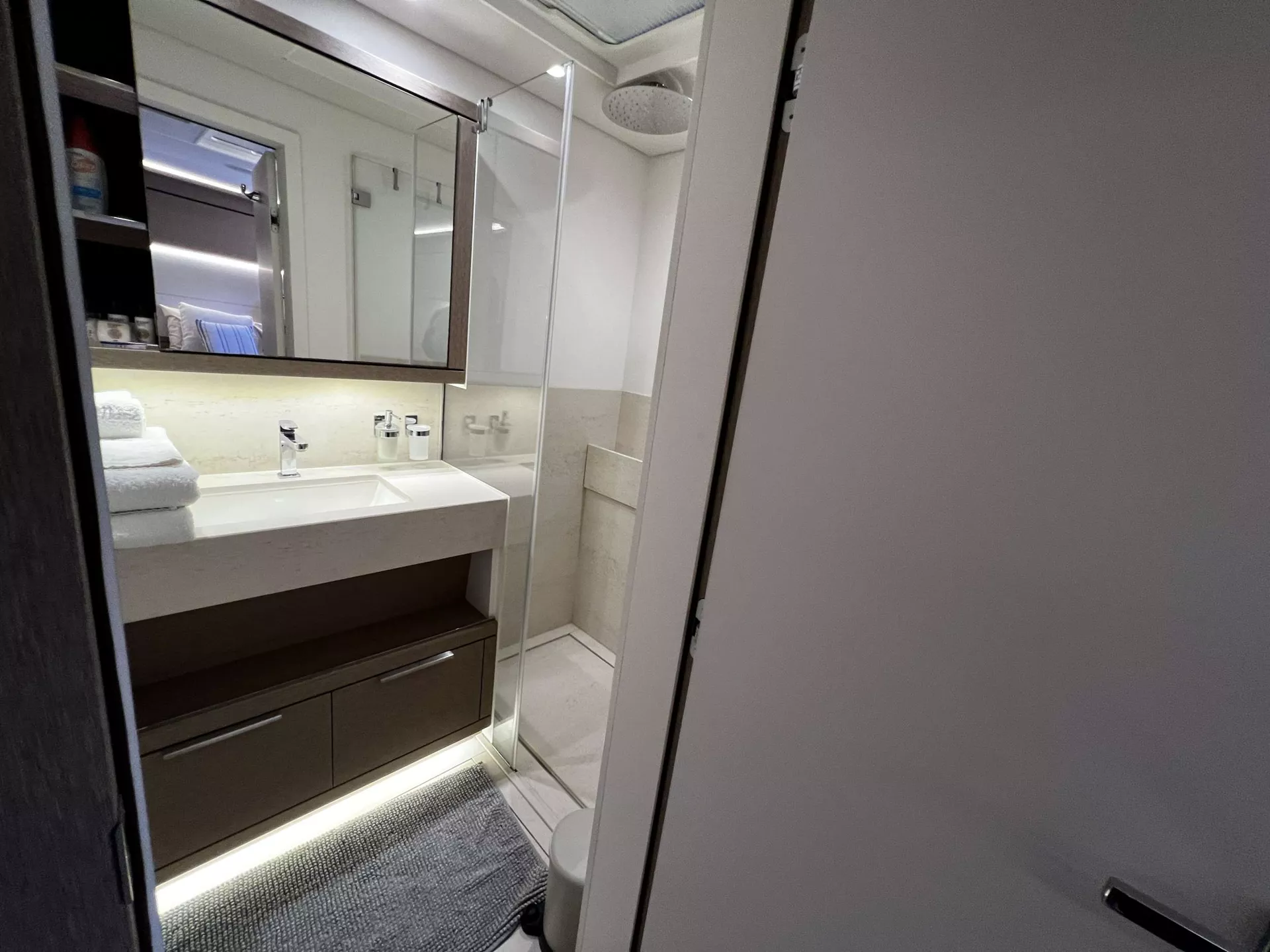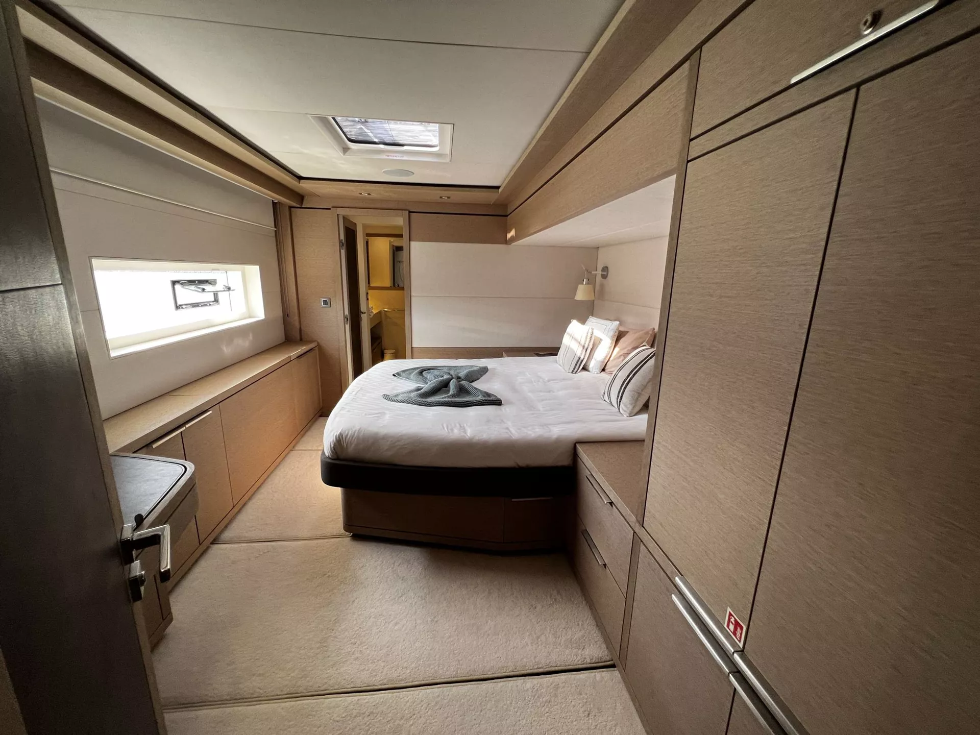 Accommodating up to 6 guests in three luxurious en-suite cabins, Just Marie II offers an atmosphere of refined exclusivity. Her master suite is a true private retreat, featuring a dedicated sitting area, his-and-hers closets, and a private balcony that opens directly over the sea — perfect for morning coffee, sunset cocktails, or an intimate swim platform experience. Two VIP queen cabins provide equal comfort and style, each with private en-suite facilities. With her 36-foot beam, Just Marie II offers immense volume and open living spaces typically reserved for much larger yachts, ensuring every guest enjoys both privacy and freedom.