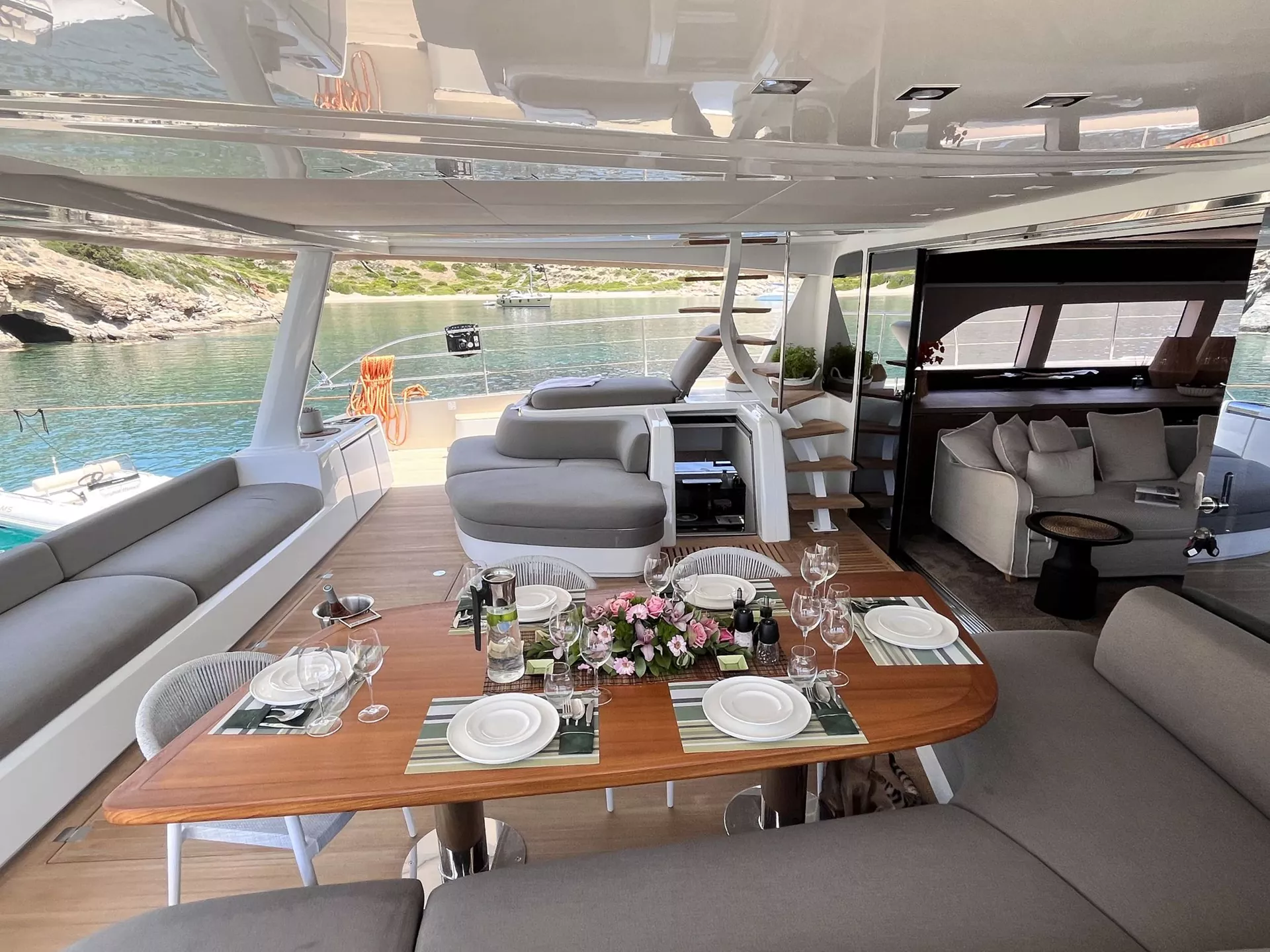 The foredeck is designed for those who love the sun — a serene space fitted with loungers and unobstructed ocean views. The aft deck transforms into a chic alfresco dining area, ideal for formal dinners or relaxed evening gatherings overlooking the sea. Above, the expansive flybridge serves as the yacht’s social heart — complete with a bar, dining table, and generous lounge area, it’s the perfect place to enjoy a meal, sip cocktails, or simply take in the panoramic vistas as the world drifts by. A retractable shade ensures comfort at any hour of the day.