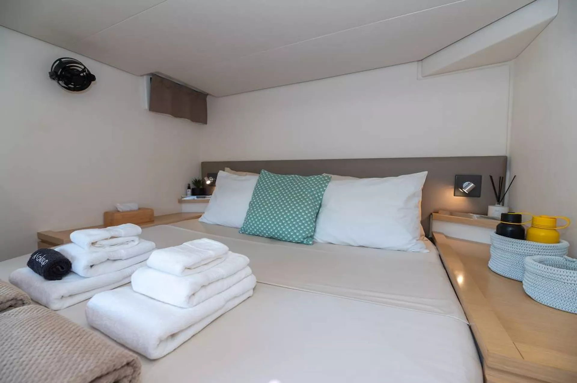 Purpose is the Quintet version of the Saba 50, offering five guest cabins in total: three located in the port hull and two in the starboard hull. A sixth cabin, situated mid-starboard, is reserved for the crew. All guest cabins feature private en-suite bathrooms, ensuring comfort and privacy for every guest.