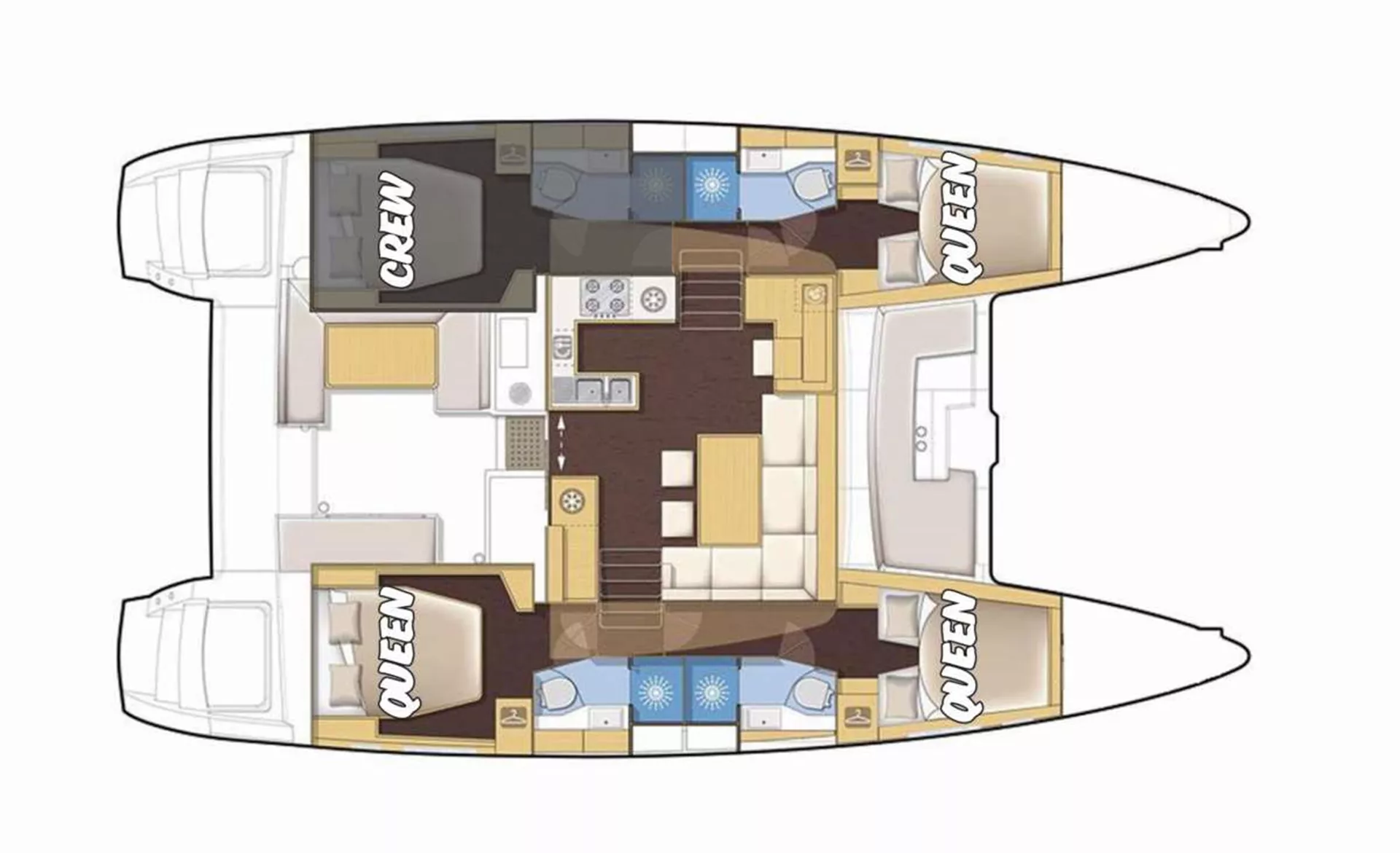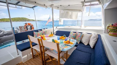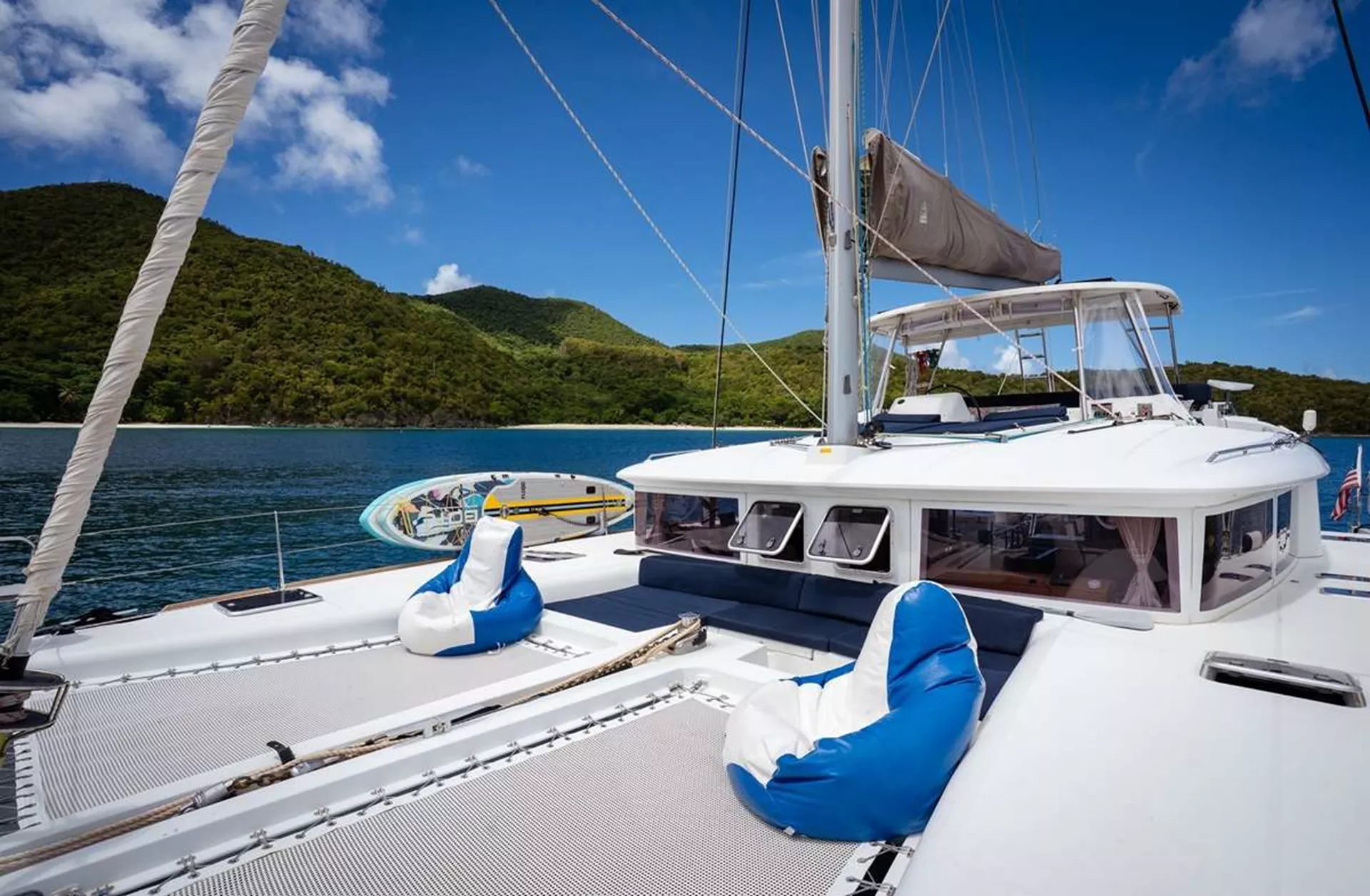 This beautiful 2016 Lagoon 450F Catamaran is built with 3 queen cabins each with private ensuite baths including electric heads, vanity and separate showers. She boasts multiple areas to sit and relax or sip a cocktail and enjoy the cool island breeze of the beautiful Caribbean. The salon will seat up to 6 guests in comfort for lounging or dining. The exterior aft offers alfresco dining for up to 6 guests, top deck seating and lounge area in front of helm plus forward lower deck lounge area behind trampolines. Crewed with the fun owners of the vessel, Capt. Joe and Chef/First Mate Holly, guests will never forget their experience on KNOT 5280!