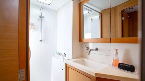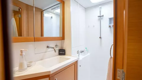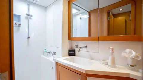Private ensuite with electric fresh water toilets, dry shower stall and sink.