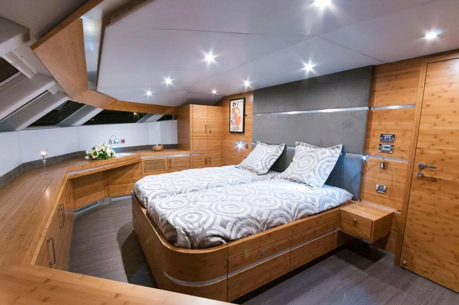 Boasting a multi-hull design, SKYLARK provides maximum stability both at anchor and underway. SKYLARK is as powerful as she is efficient. Low fuel consumption is just one of the many attributes that make SKYLARK the perfect yacht for your next vacation. Boasting an exterior that's just as impressive, SKYLARK features a spacious sunbed on the fly for you and your guests to enjoy. The perfect spot for those cool nights on the water, the sun deck offers ample seating areas for sunbathing, lounging, or dining al fresco! SKYLARK also features a generous swim platform, perfect for a quick dip or a day on the water. However you choose to spend your next Mediterranean yacht vacation, let SKYLARK take you there.