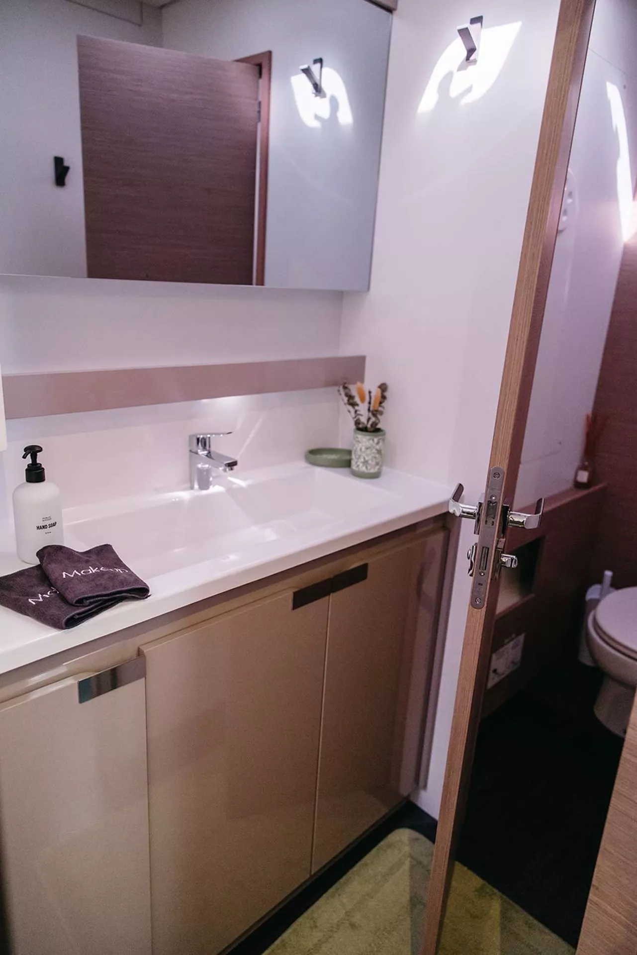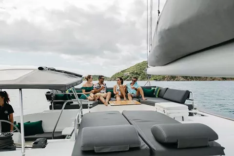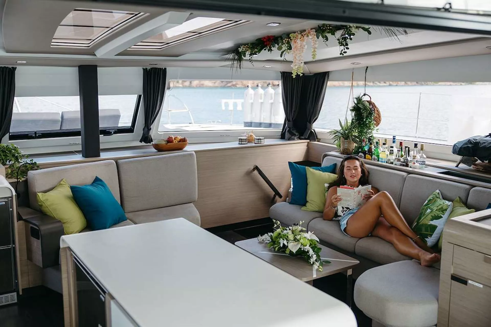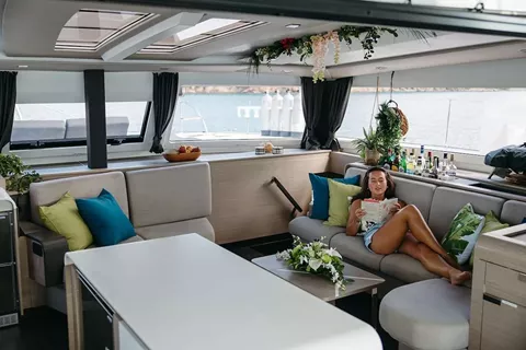 This 2022 51' Fountaine Pajot sailing catamaran is nothing short of extraordinary. G3 takes sailing charter yacht luxury to the next level as she boasts four large queen berths each with private ensuite baths including electric heads, vanity and separate showers. Cabins and yacht common areas offer wonderful natural lighting and great ventilation with full custom air-conditioning. The salon will seat all guests in comfort for lounging or dining with the exterior offering an alfresco dining experience to remember. Top deck seating and villa-style aft lounge area make this charter yacht one-of-a-kind. With numerous lounging areas to stretch out, there is plenty of space for gathering as a group or finding a private place for one or two to take all the Caribbean in.