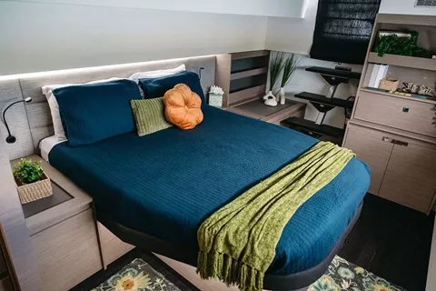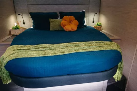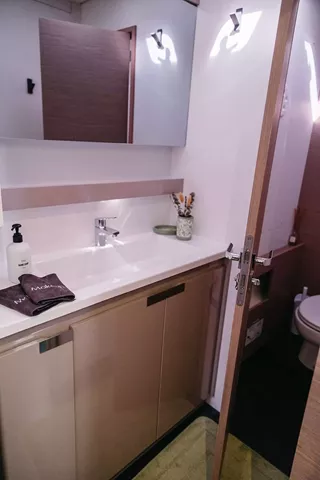 (4) queen cabins, each with private ensuite bath with electric toilet, wash basin and separate shower stall. Spacious master stateroom has desk space, separate toilet room, and walk-in shower. All cabins have air conditioning, two fans, 110v outlets and dimmable recessed lighting.