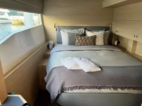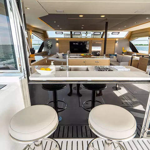 When the sun has set and you are ready to rest, you will feel at home in our spacious and comfortable cabins. Each cabin is equipped with storage space for your belongings and a queen bed. (King in master) The galley and salon have a contemporary configuration and an open-concept space perfect for enjoying time with friends and family. A flat screen TV is placed on the back wall for viewing pleasure in and out of the salon at the barstool seating. Wi-Fi and StarLink are also included should you choose to stay connected on your dream vacation.