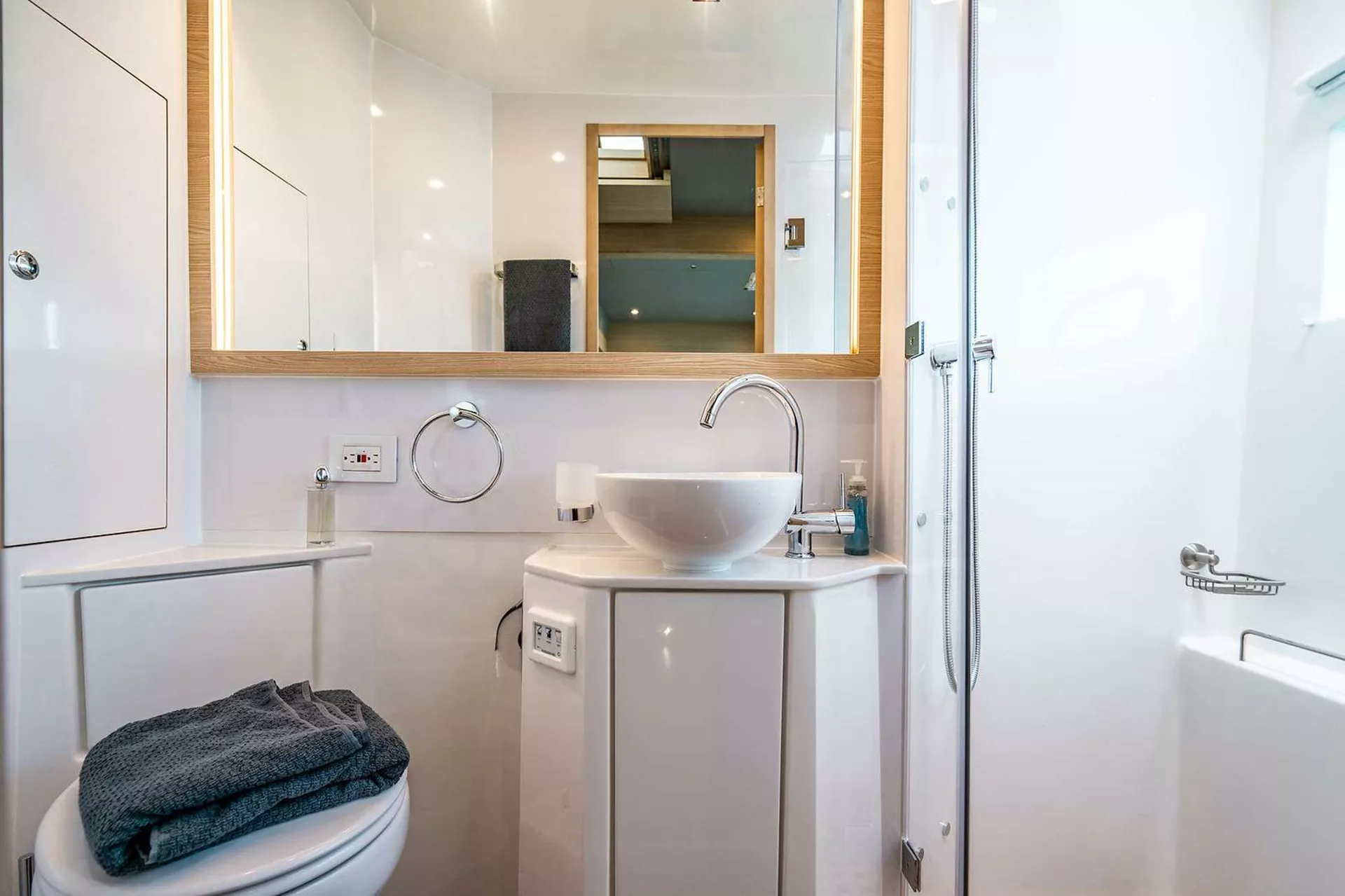 When the sun has set and you are ready to rest, you will feel at home in our spacious and comfortable cabins. Each cabin is equipped with storage space for your belongings and a queen bed. (King in master) The galley and salon have a contemporary configuration and an open-concept space perfect for enjoying time with friends and family. A flat screen TV is placed on the back wall for viewing pleasure in and out of the saloon at the barstool seating. Wi-Fi and StarLink are also included should you choose to stay connected on your dream vacation.