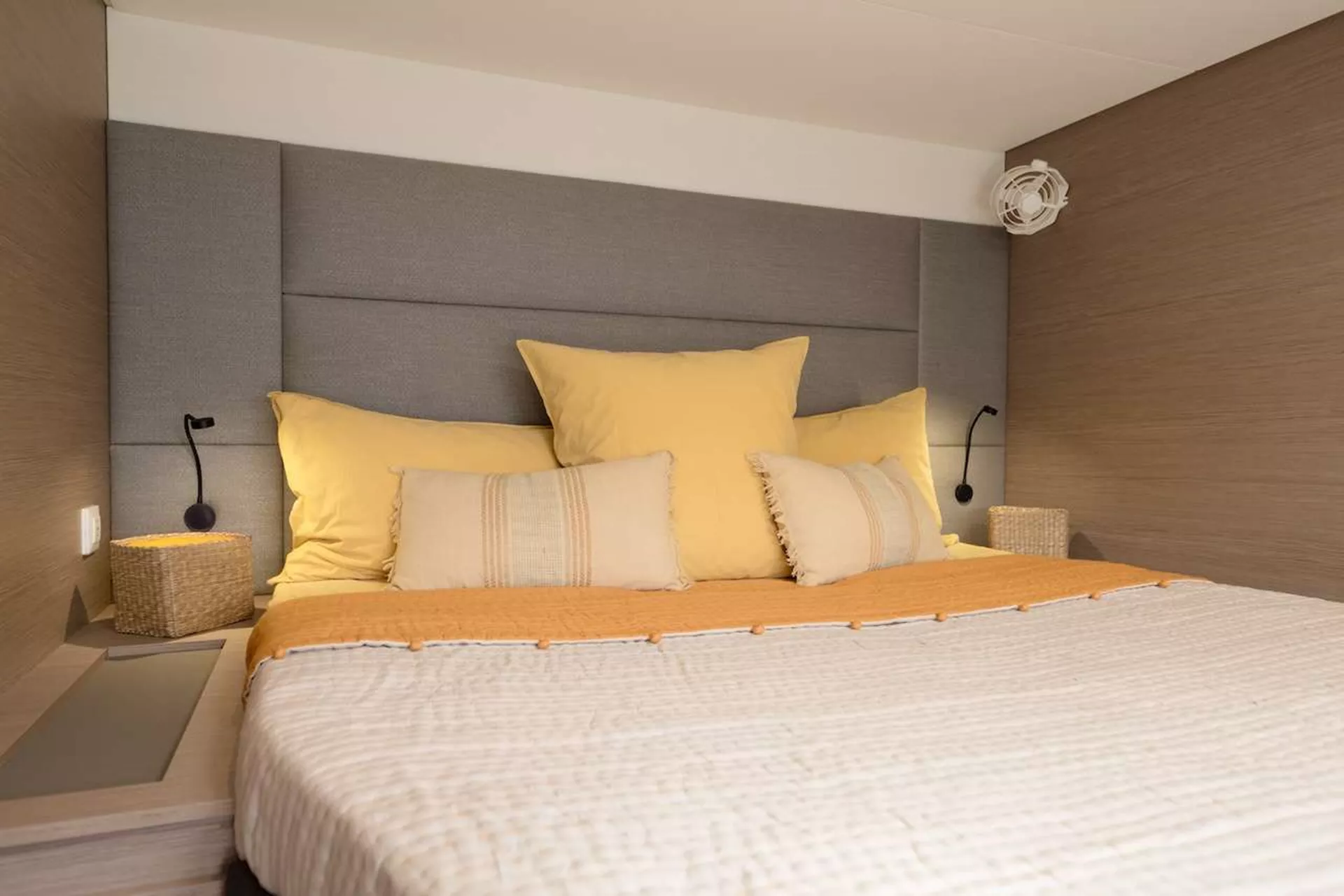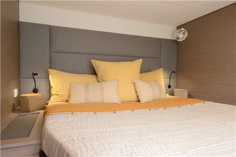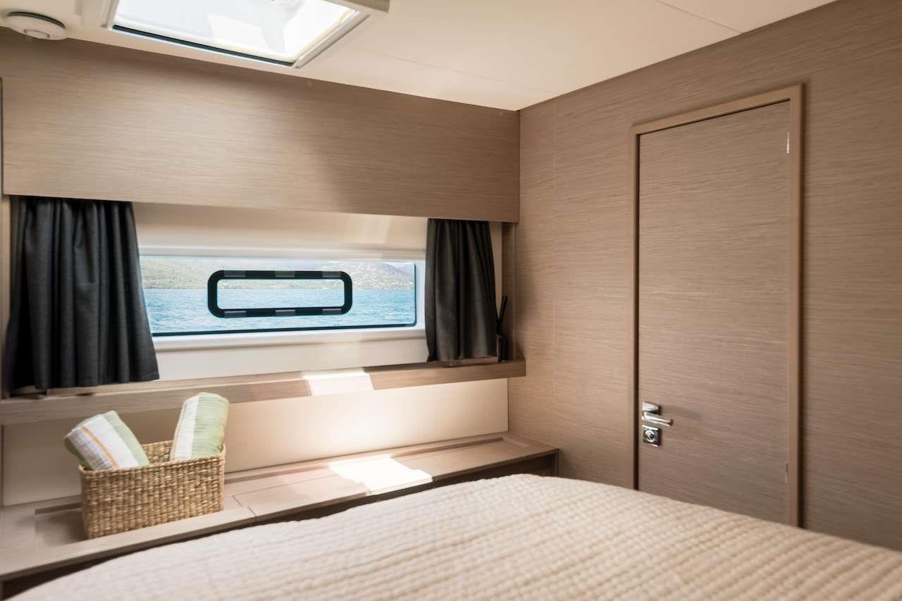 With cream upholstery which contrasts the pale oak cabinetry and dark oak flooring, the sense of chic living is effortlessly achieved. Due to its design, Beyond’s cabins offer sources of natural light from flush deck hatches overhead and large hull windows making guests’ nights more enjoyable and restful.
