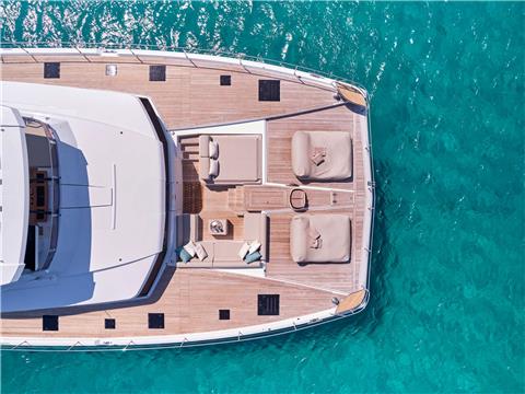 Sunbathing places, a griddle-equipped kitchen, and a large lobby. Dream of the unachievable on the 32 m2 Flybridge or relax in the front lounge jacuzzi.