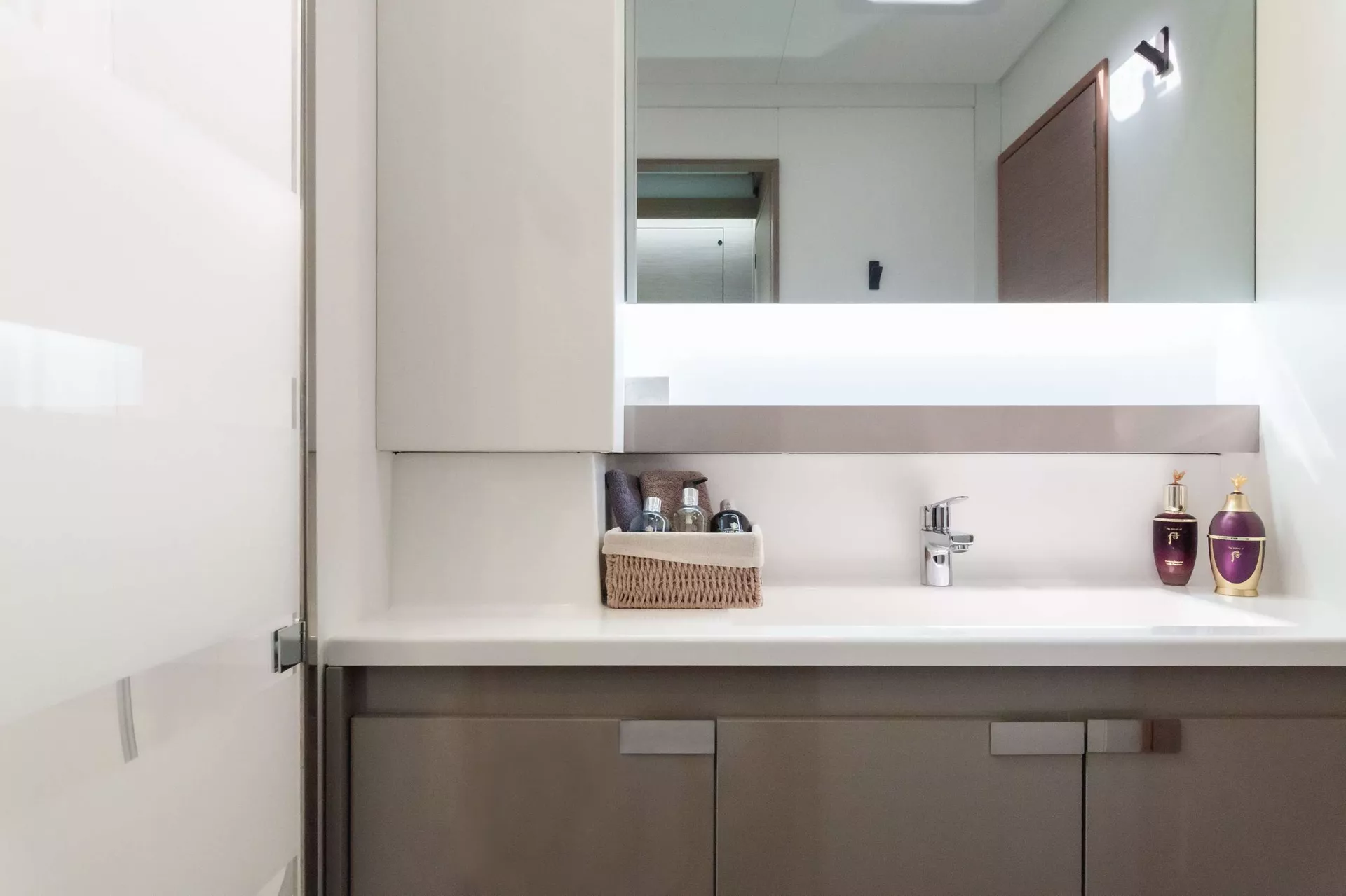 One of AMANTE’s standout features is her exceptionally spacious and thoughtful interior layout. She accommodates guests in four beautifully appointed cabins, each with its own private en-suite bathroom with separate shower, ensuring comfort and privacy for families or groups of friends. Every cabin is fully air-conditioned and carries the charming touch of being named after iconic Italian actresses—so you may find yourself drifting to sleep in Monica Bellucci or Claudia Cardinale’s cabin!