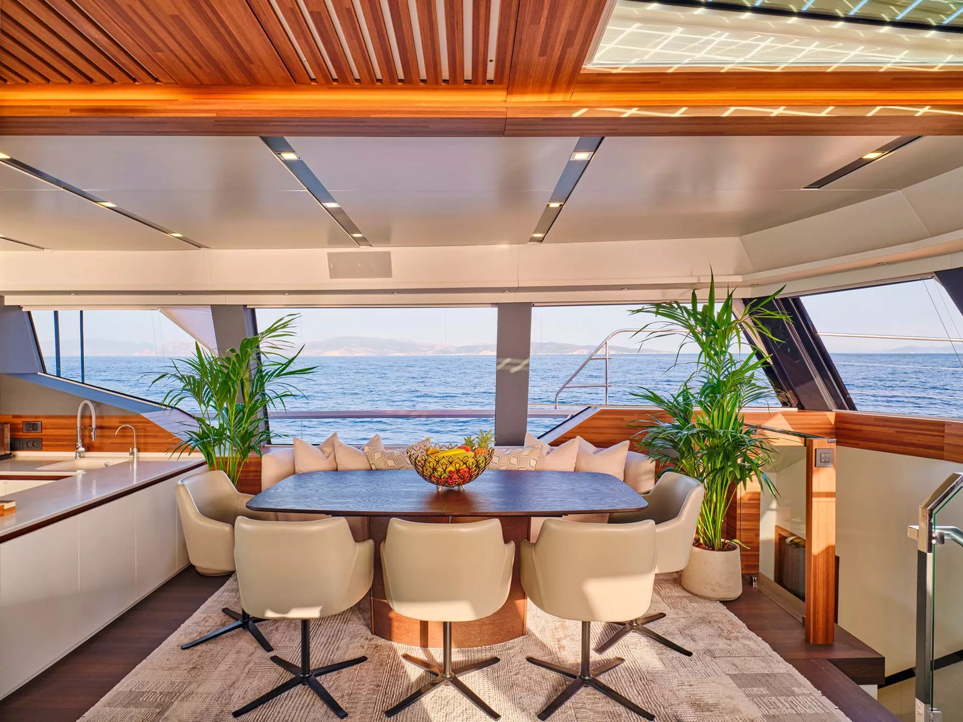 Outdoors, the flybridge and forward deck provide plenty of space for sunbathing and relaxation, allowing you to soak up the sun while enjoying breathtaking views of the ocean. The aft cockpit is perfect for socializing with friends and family, as well as indulging in alfresco dining experiences that will leave you craving more.