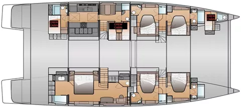 One master cabin (Bed size 1,80 x 2,00 m) and four queen bed guest cabins (bed sizes 1,60 m x 2,00 m) all with private facilities