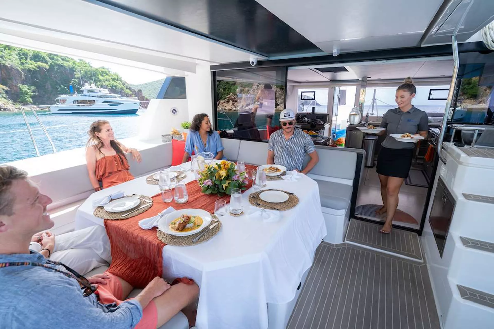 Salon has lounge area, galley, nav station, formal dining area and door opening to front cockpit as well as aft deck. Salon can be opened with beautiful natural breeze and is also fully air conditioned for guests comfort.