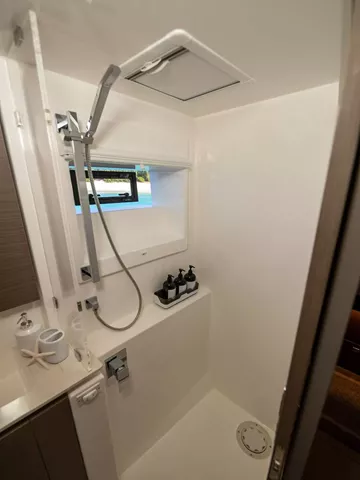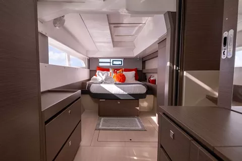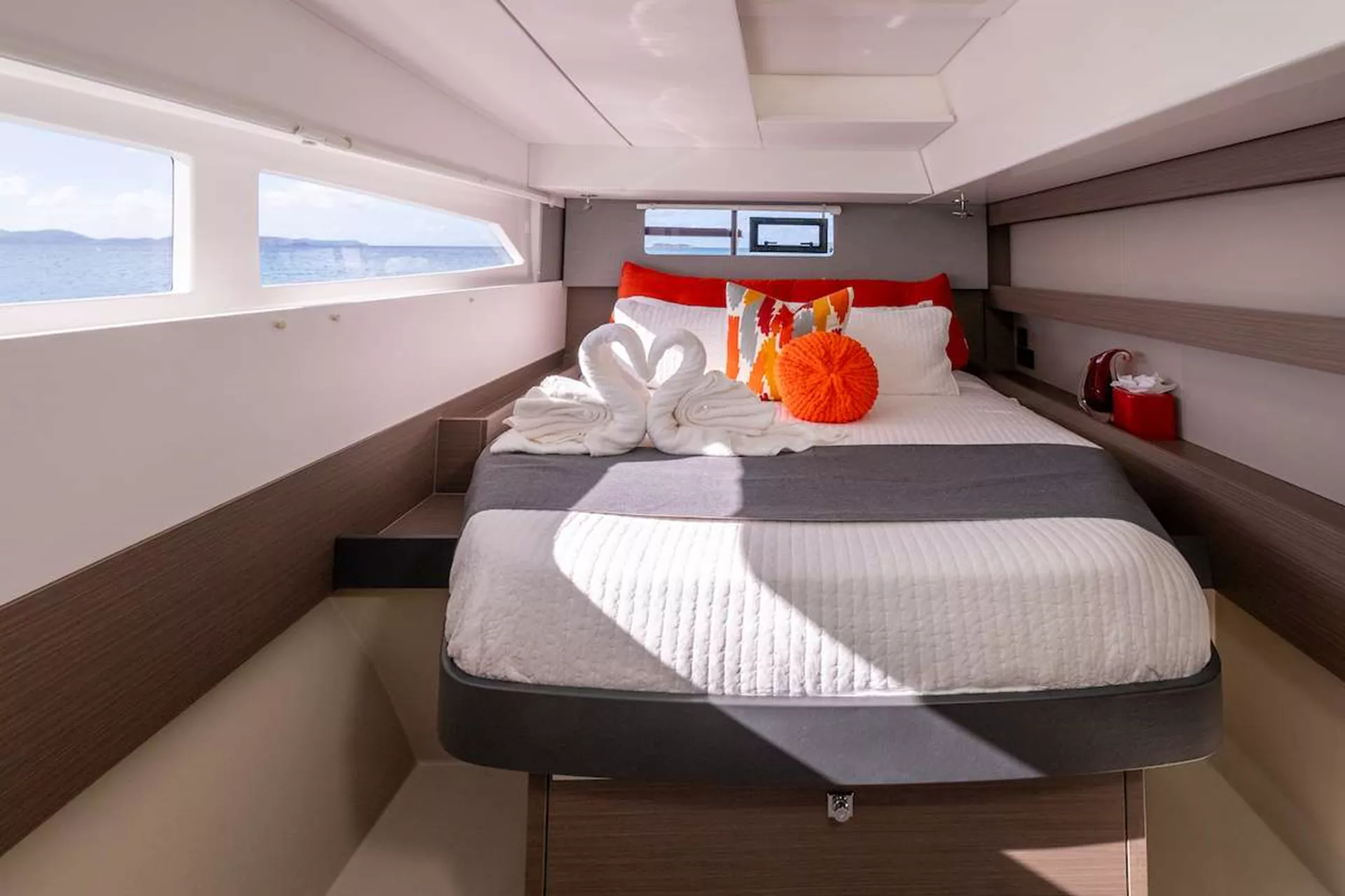 1 master cabin with queen berth, vanity area and en-suite bath, electric toilet and a stall shower. Individual A/C control for guest comfort.