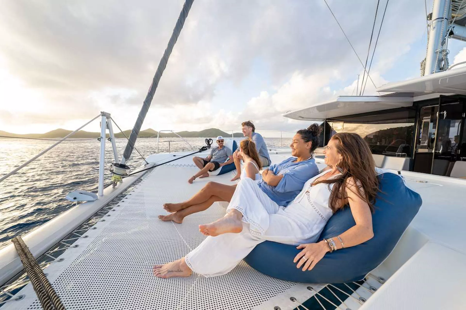 Top fly-bridge lounge area with 360 degree view, table, sunbed, lounge area with table is ideal for enjoying the Caribbean sunsets.