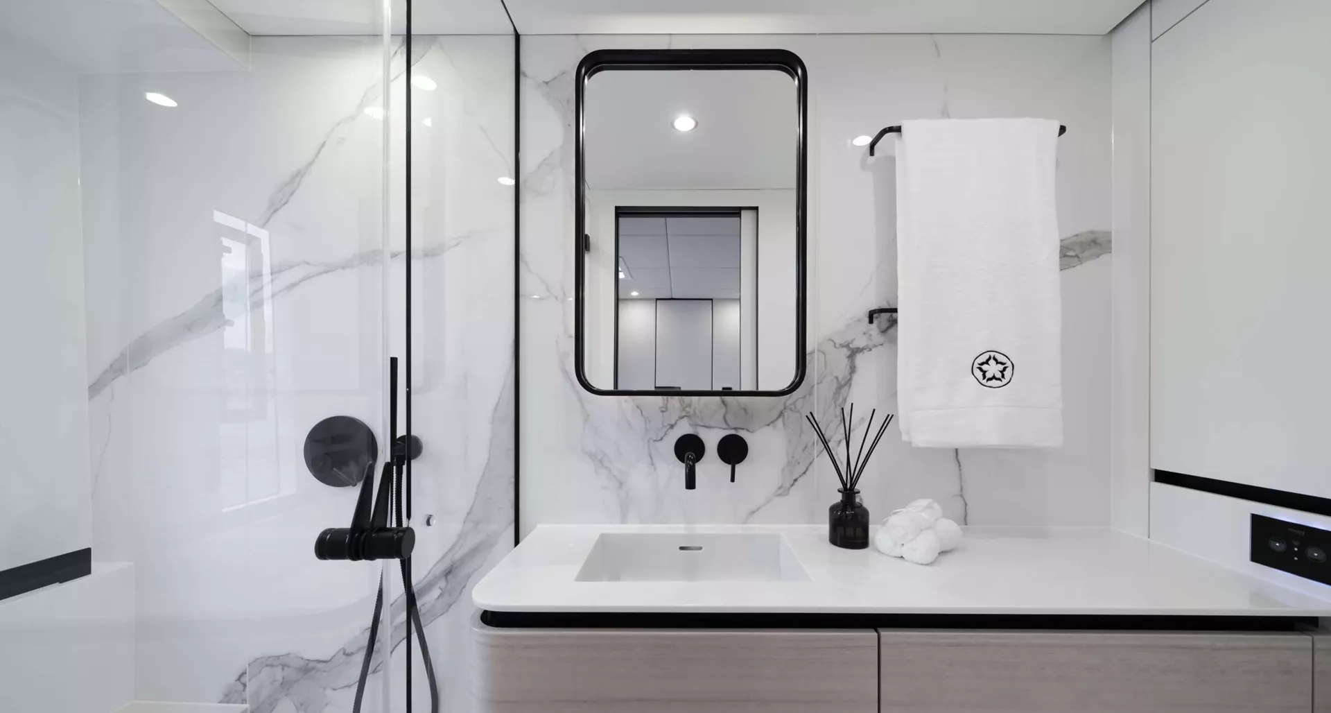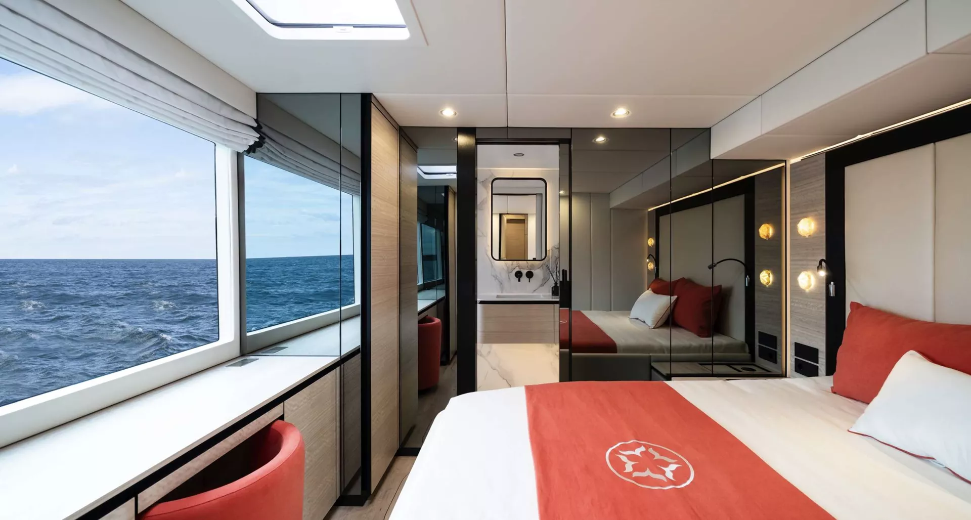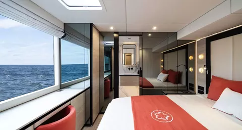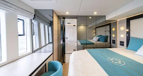The Master Cabin features a King Size bed (193cm) with Tempur mattress and pillows, facing the ocean through its massive window. The Master Cabin offers a walk-in closet, multiple storage options as well as a unique bathroom design with separate toilet and ocean-facing shower.