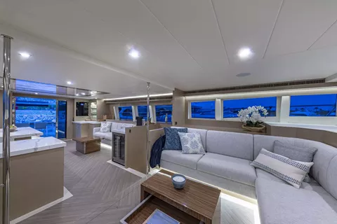 Featuring a Wyoming King Primary Stateroom (Bed Size 7ftx7ft) walk-around bed, reading lights, bedside USB and US plugs, a Fushion sound system, and a 32” smart TV. The stateroom has tinted, UV-rated windows and a luxurious ensuite with a walk-in shower, separate toilet, his and hers basins, cabinets, and vanity. The space is complete with a full-height closet and 6’8” headroom for added comfort.