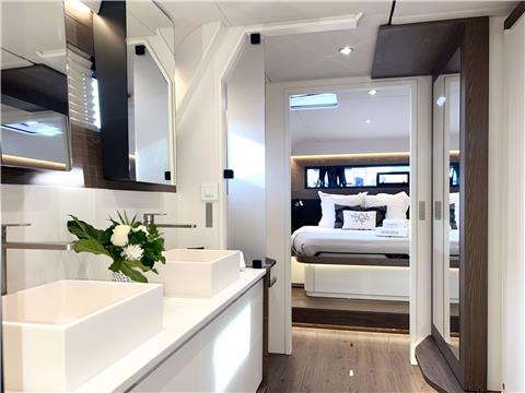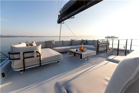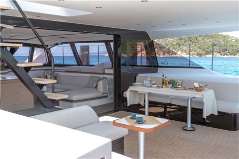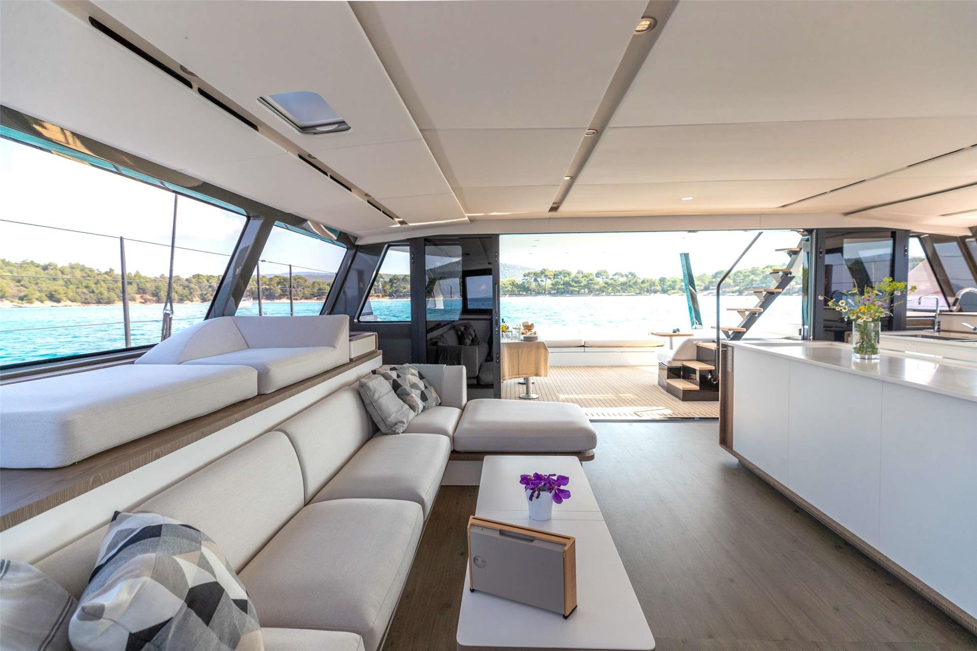 Conceived for the liveaboard lifestyle, the enormous salon provides a protected safety zone, with a lounge area to starboard and a gourmet galley to port.