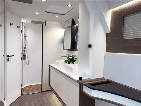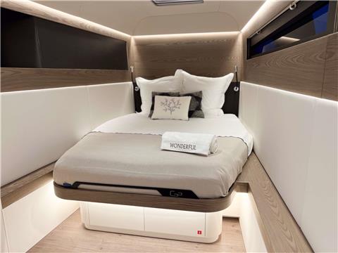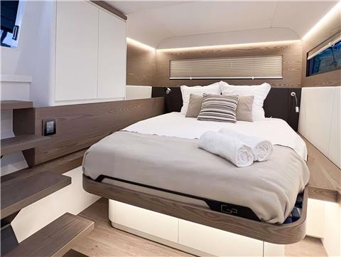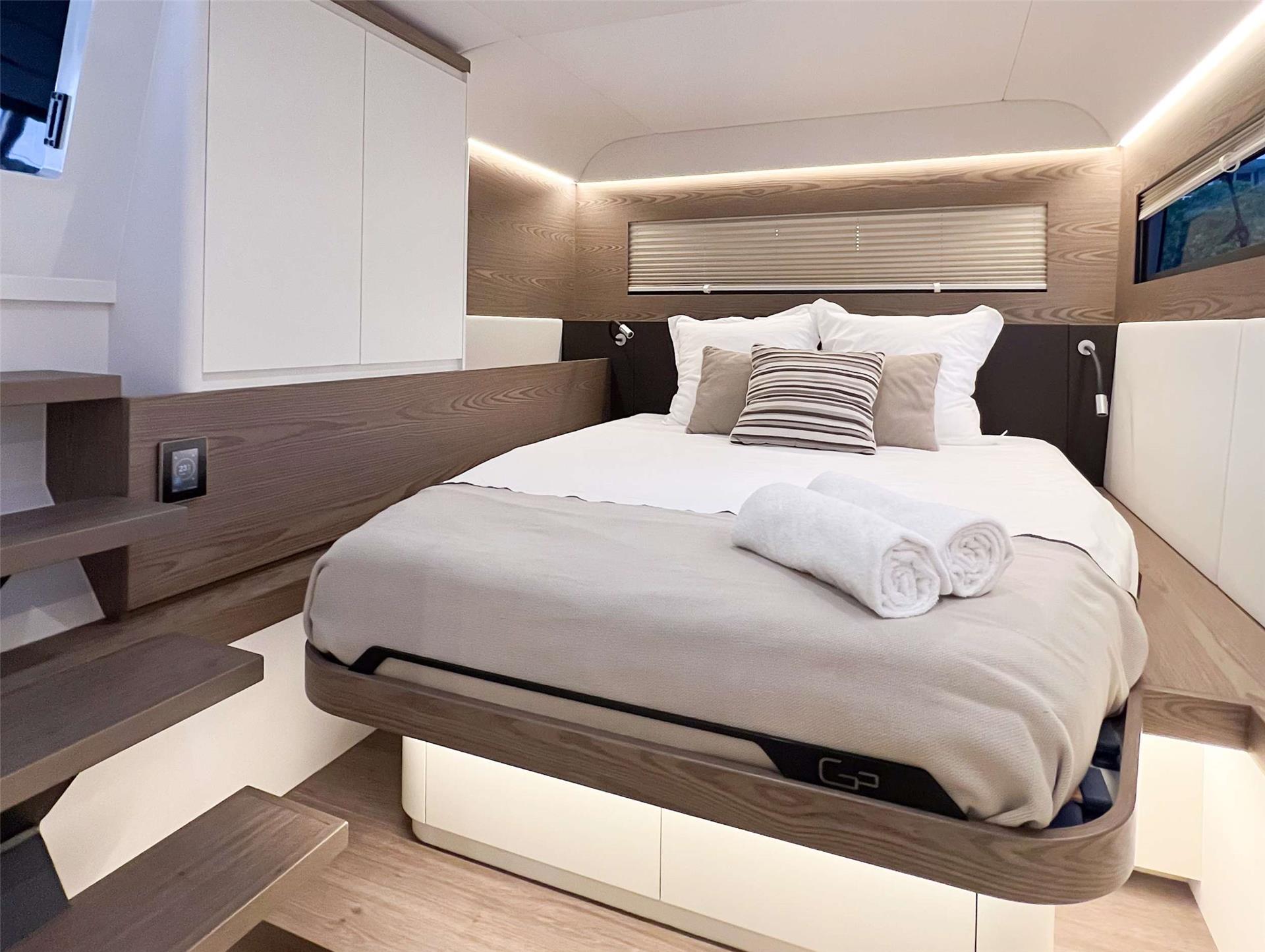 Connected to the salon by large sliding doors, the aft cockpit is the heart of entertainment. It’s the go-to spot for lounging and dining, just steps from the transom for a refreshing swim and the wet bar for happy hour - as welcoming to a party of 20 as it is to a few.