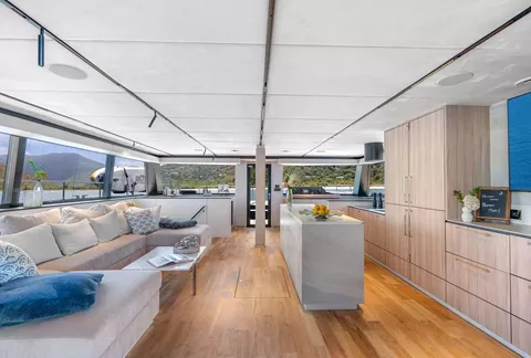 Main Salon: A bright, open-plan interior with panoramic views, sophisticated décor, and plush seating—perfect for relaxing or enjoying a movie.