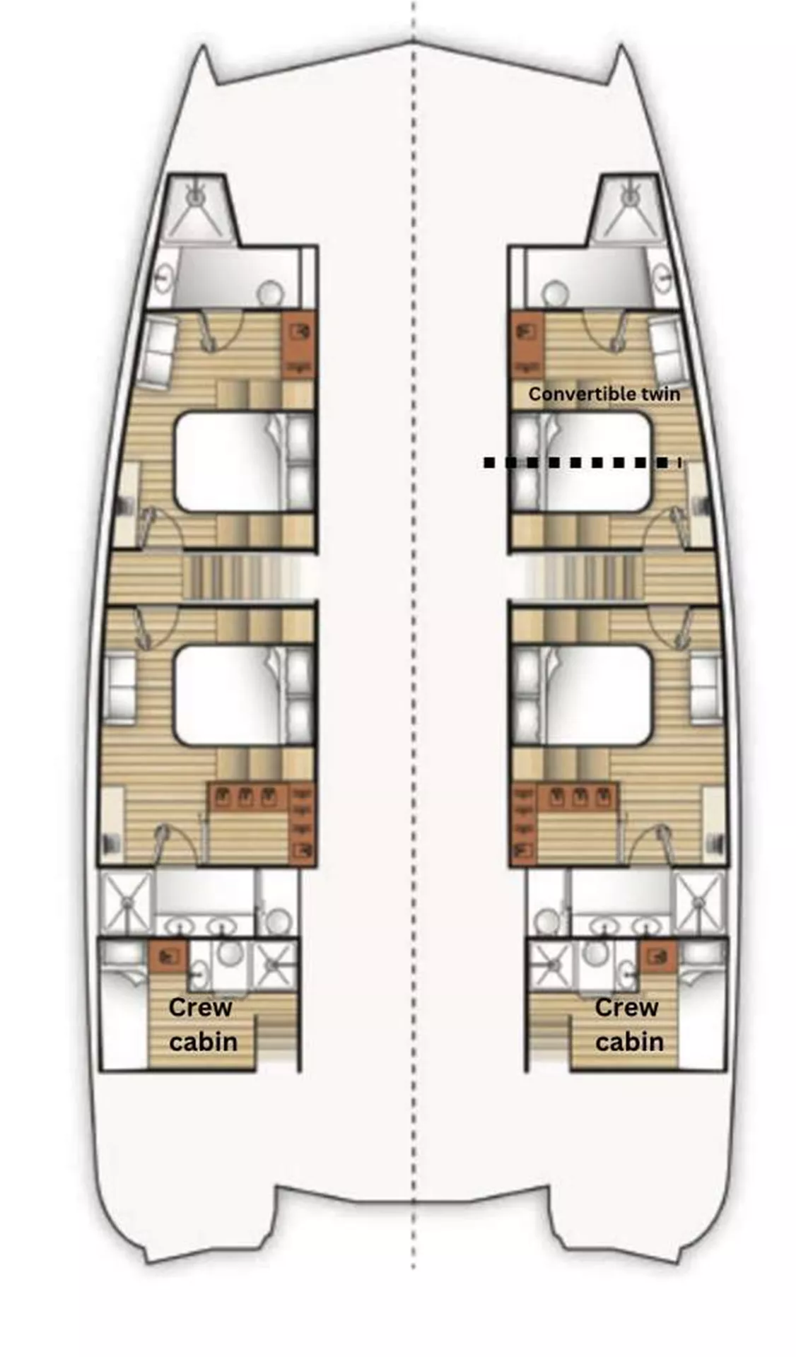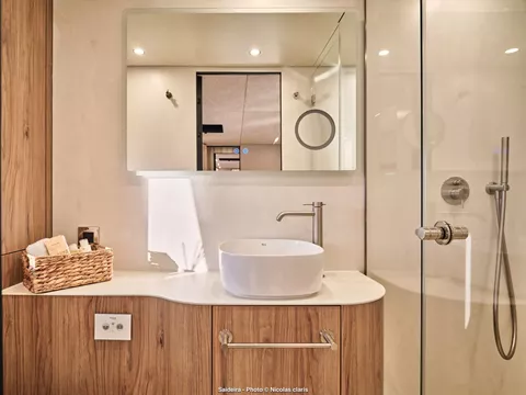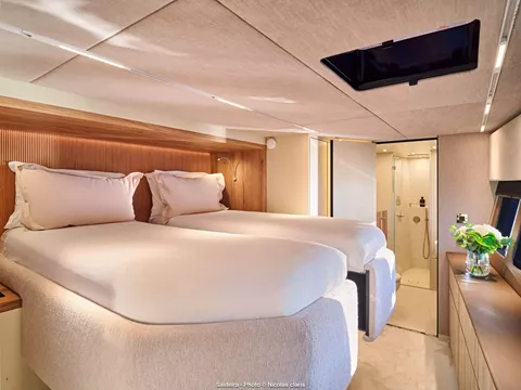 The Moon Yacht 60 Catamaran, Saideira, is indeed a marvel in luxury sailing, offering an exceptional experience for those seeking comfort and style on the open seas. The 19.33-meter catamaran boasts a thoughtfully designed 4-Cabin layout, ensuring a spacious and comfortable stay. The cabins comprise two VIPs and two guests all equipped with full air-conditioning and en-suite facilities.